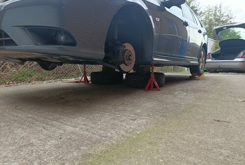Mache es sehr ähnlich zu deiner Methode. Wobei ich vorn meistens auf Rampen fahre bevor ich den Wagenheber ansetze. Beim Ansetzen am Hilfrahmen sollte man unbedingt auf eine ausreichend große Auflagefläche achten. Wenn ich seitlich hebe und Kraft anwenden muss kommt ein Bock unter die Querträger bzw. unter die Hinterachse.
