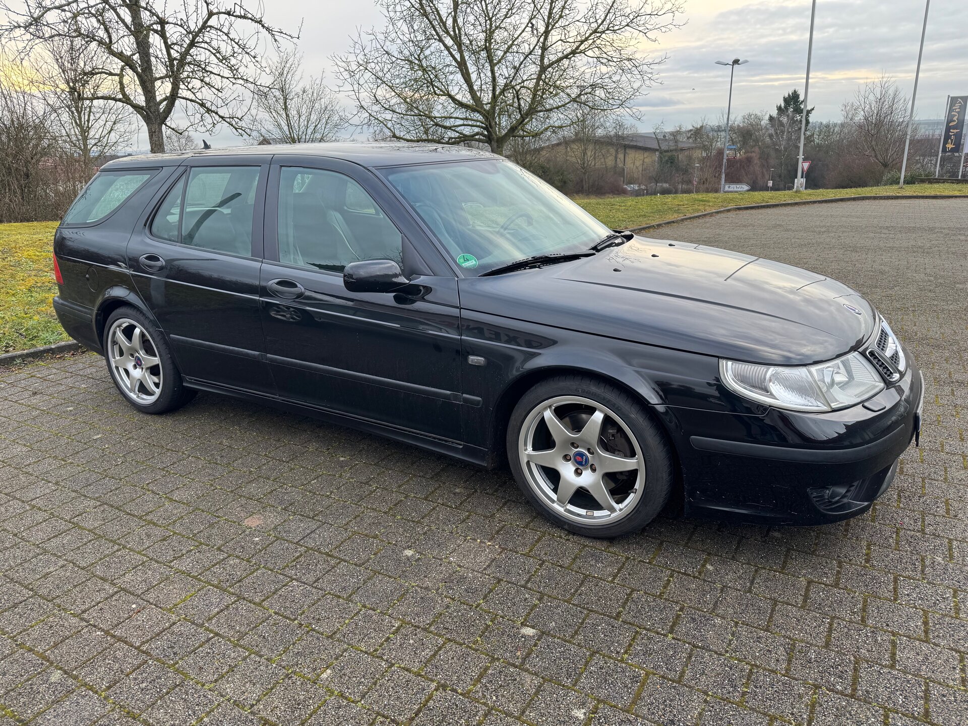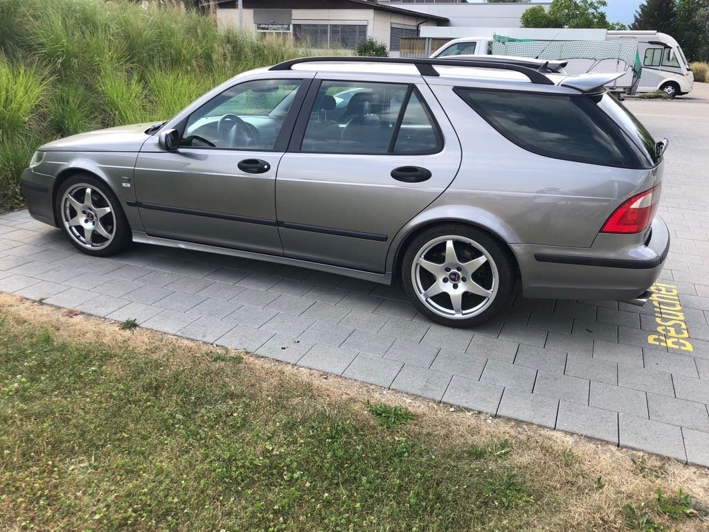 Aktuell 9-5 Aero SportCombi aus 2003, schwarz, innen grau, 280 PS, 18 Zoll Hirsch mit SR, 17 Zoll Aerofelgen mit WR, Hirsch Grill, Dachspoiler und Auspuffanlage.