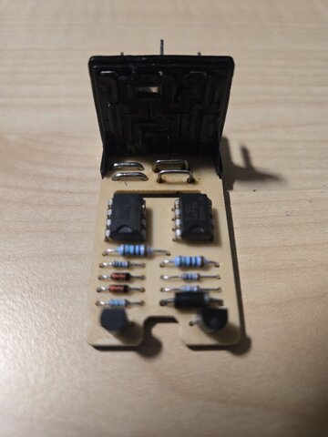 Habe dann halt nochmal ein LCR geöffnet: . Die für den U479B als Schwelle angegebenen 8 mV scheinen im übrigen nach oben zu streuen und real eher >9 mV zu sein. Bei 14 V sollte man also sicherheitshalber schon so bei mind. 10 - 11 mV landen. Kann man direkt an den Schönts messen, oder zwischen Pin 2 und 4 bzw. Pin 2 und 6 des Maikäfers. Auch wenn ich jetzt schon 4 LCRs umgelötet habe, messe ich jeden einzelnen Schönt aus und spiele dann ggf. etwas mit der Länge indem ich ihn etwas weiter heraus ziehe oder etwas tiefer setze. Beim Test mit 14 V am Netzgeräteausgang liegt mein Zielbereich bei 11,5 +/- 0,5 mV über den Schönts bzw. den o.g. Pins. Hinsichtlich der Verlustleistung mache ich mir da auch bei ein paar mV mehr keine Sorgen. Denn beim Glühobst mit seinen rd. 5 A landen wir bei 10 mV bei 0,05 W. Und wenn wir jetzt 1,2 A bei sagen wir mal zur Sicherheit 12 mV haben, sind es weniger als 0,015 W. Wer jetzt allerdings, z.B. für den Besuch beim Prüfer des geringsten Mißtrauens wieder Standard-Glühobst verbaut, kommt mit 5A dann zwangsweise auf 50 mV und damit fette 0,25 W. Das ist dann halt das 5fache der Standardkonfiguration. Daher würde ich, wenn man das Leuchtmittel schon wechselt, auch immer (sofern vorhanden) ein Serien-LCR stecken. Das ist gerade im Vergelich zum Wechsel des rechtsseitigen Leuchtmittels im Vorbeigehen erledigt und macht daher den Kohl dann auch nicht mehr fett.