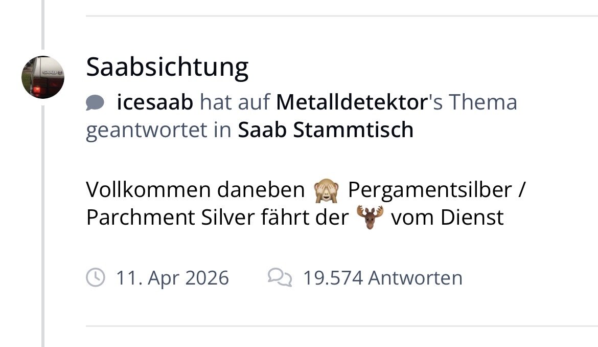 Echte Saabsichtung heute gegen 16:45h Lübbecke, Jockweg - silberner 9-5 Kombi - MI xx xxxx - ohne Gruß 🫤 …..war ja auch nur im unauffälligem 96er unterwegs 😉