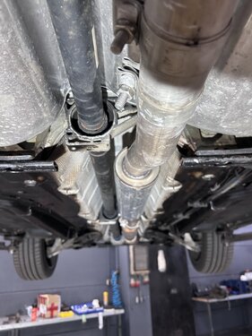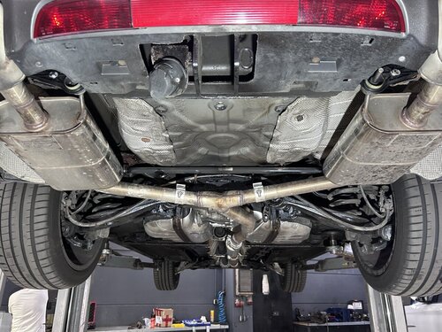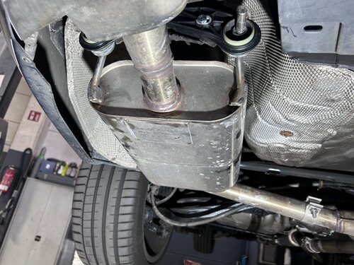 Nachdem ich in der Original Anlage ein Loch am Y-Stück hatte, beschloss ich die komplette Anlage von Heuschmid verbauen zu lassen und dann auch gleich den TÜV mit dazu. Ausserdem war das Hitzeschutzblech vom Tank in Auflösung begriffen. Zum Glück wieder verfügbar und da dafür Auspuff und Antriebswelle entfernt werden müssen, gleich mitmachen lassen. Anlage Die Anlage hat allerdings entgegen der Info auf der Webseite noch keine vollständige Zulassung für den V6, da wartet Hauschild noch drauf, bekomme ich noch zugeschickt. Fa. Heuschmid hat allerdings viel zu tun, so 3-4 Monate Vorlauf sollte man einplanen, mich konnte sie dankenswerter Weise dazwischen schieben. Alle Arbeiten wurden sorgfältig ausgeführt, auch das Hitzblech vor Einbau noch mal extra gegen Rost geschützt, damit es nicht gleich wieder weg schimmelt. Die alte Anlage habe ich wieder mitgenommen, wer Interesse und Bedarf hat, bitte gerne melden. Die Endschalldämpfer sind noch ok ohne Loch, dito der Vorschalldämpfer. Bilder auf Anfrage. Im Klang wenig Unterschied zur alten Anlage, passt gut zum Fahrzeug. Die Halterungen habe ich im Nachhinein noch selber getauscht. Bei der Abholung hatte ich auch noch Gelegenheit mit dem Senior zu sprechen, sehr interessant, was der zu erzählen hat und was in der Firma alles rumsteht inkl. 9-3 Roh-Karossen direkt vom Band ist schon faszinierend.