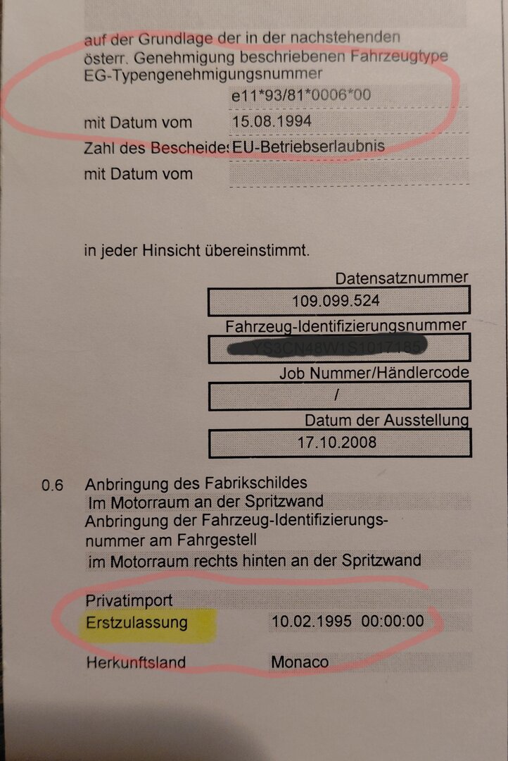 @ST 2 nein, das Auto stand in Hamburg, und ich als "Exildeutsche" habe in Deutschland schon alles ausgeschöpft, was mir zur Verfügung stand, wie gesagt, beim BKA, mein Cousin ist bei der größten Versicherung und hat zu einer Datenbank zugriff, wo alle KFZ-Versicherungen zugreifen, diese VIN war nirgends in Deutschland gemeldet, oder registriert. Die VIN lautet: YS3CC65B7R1014978 Der Beklagte, so nenne ich ihn mal, da ich nicht weiß, ob das Auto auch auf ihn zugelassen war (Eigentümer) , oder ob er nur der Besitzer war, dass er das Auto von irgendwo geholt hat... und nie angemeldet hatte... dieser ist seit 2001 wie vom Erdboden verschwunden, ich weiß, dass es noch Klagen gibt, er aber nie zu einem Prozess erscheint... alles Dubios. Zu der Frage, AT oder CZ... In Österreich musste ich bei der BH (Oberste Polizei) die Abfrage machen, ob das Auto gestohlen war, alles unter Eidesstatt... habe ich, dann brauche ich ein Gutachten, von einem zugelassenen Oldtimer-Gutachter... (nicht irgendeiner) hätte ich einen an der Hand (hat mir auch beim 9000 CD geholfen, da war aber nur ein Zahlendreher in der VIN) Jedenfalls wenn ich das Gutachten habe, dann muss ich nach Linz zum Verkehrsamt, dort eine Vollabnahme, das Auto für 7 Tage anmelden, dann hätte ich Papiere und könnte mit ihm nach CZ fahren... die Kosten ca. 500 - 700 Euro. In CZ, zum STK (TÜV) Vollabnahme, dann zur Zulassungsstelle, die erstellt mir die Papiere neu, und gut ist... ABER! sie braucht das Zulassungsdatum ... mehr nicht, diese Variante ist einfacher und Kosten ca. 300 Euro. Echt, ein Auto, was so gepflegt ist, KEIN Rost... sowas habe ich noch nie gesehen, der Innenraum gepflegt, nix abgegriffen... hat aber laut Tacho über 200T km ... ich will den Kerle nicht aufgeben. Gerne melde ich mich bei dir, danke