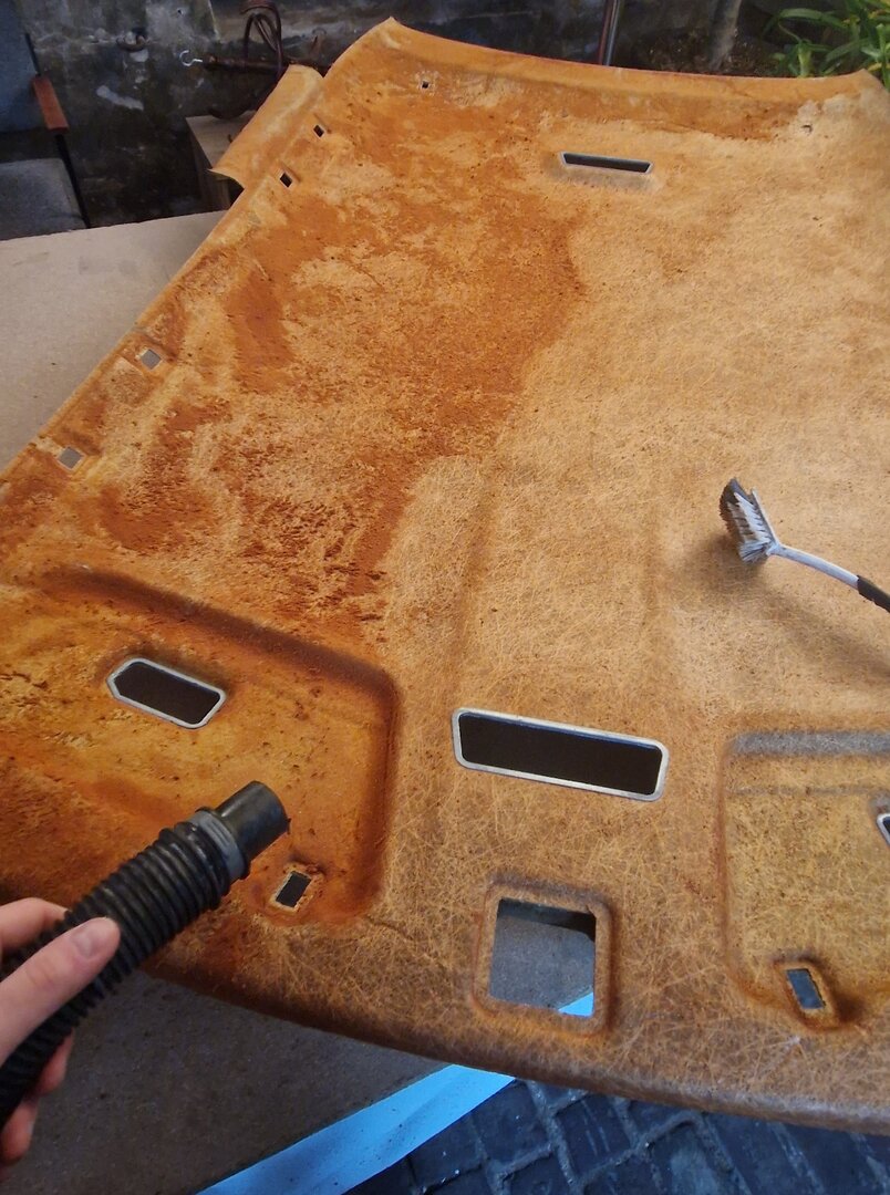So, heute ist mal wieder ein bisschen was 902-betreffendes passiert. Und zwar habe ich mich dem Dachhimmel mal angenommen. Zum einen weil er als "low hanging fruit" schon ausgebaut in der Werkstatt stand und dort auch noch alles voll rieselte. Zum anderen weil sowohl Stoff als auch Kleber vorhanden waren. Auch wollte ich mal ein bisschen Üben für den Himmel am 901, der demnächst auch auf dem Plan steht. Also erstmal mit bürste und Staubsauger die bröseligen Reste des alten Schaumstoff abgekratzt: Danach alles einmal mit Silikonentferner säubern und von allen verbliebenen Krümeln befreien. Anschließend Stück für Stück den Sprühkleber aufgetragen und nach und nach den Stoff andrücken und festkleben. Ich habe die Löcher für Lampen und co einfach überklebt, später durchschnitten und dann den Stoff mit hinter das jeweilige Teil geklemmt. Sieht im Ergebnis so aus: Ich bin, gemessen am finanziellen und zeitlichen Aufwand, recht zufrieden. Es gibt ein oder zwei Stellen, an denen ich die Kaschierung zu sehr zusammengedrückt habe, und vor allem der bereich rund um die Sonnenblenden ist etwas unsauber, damit kann ich aber leben. Es wertet das Innere des Autos auf jeden fall auf. Auch die A-Säulen habe ich natürlich mitgemacht, obwohl der Schaumstoff dort durchweg noch gut in Schuss war: Vor allem die rechte ist leider recht dellig, aber wie sehr mich das stört wird sich zeigen. Im Zweifel ist diese Verkleidung auch schnell wieder draußen und kann dann nochmal bezogen werden. Stoff hab ich noch genug. Insgesamt finde ich das kleben auf der Konkaven kontur der Himmelschale recht anspruchsvoll, da man schnell zu wenig Stoff über hat, um alle Kanten zu füllen. Einiges werde ich beim nächsten Himmel wohl anders machen.