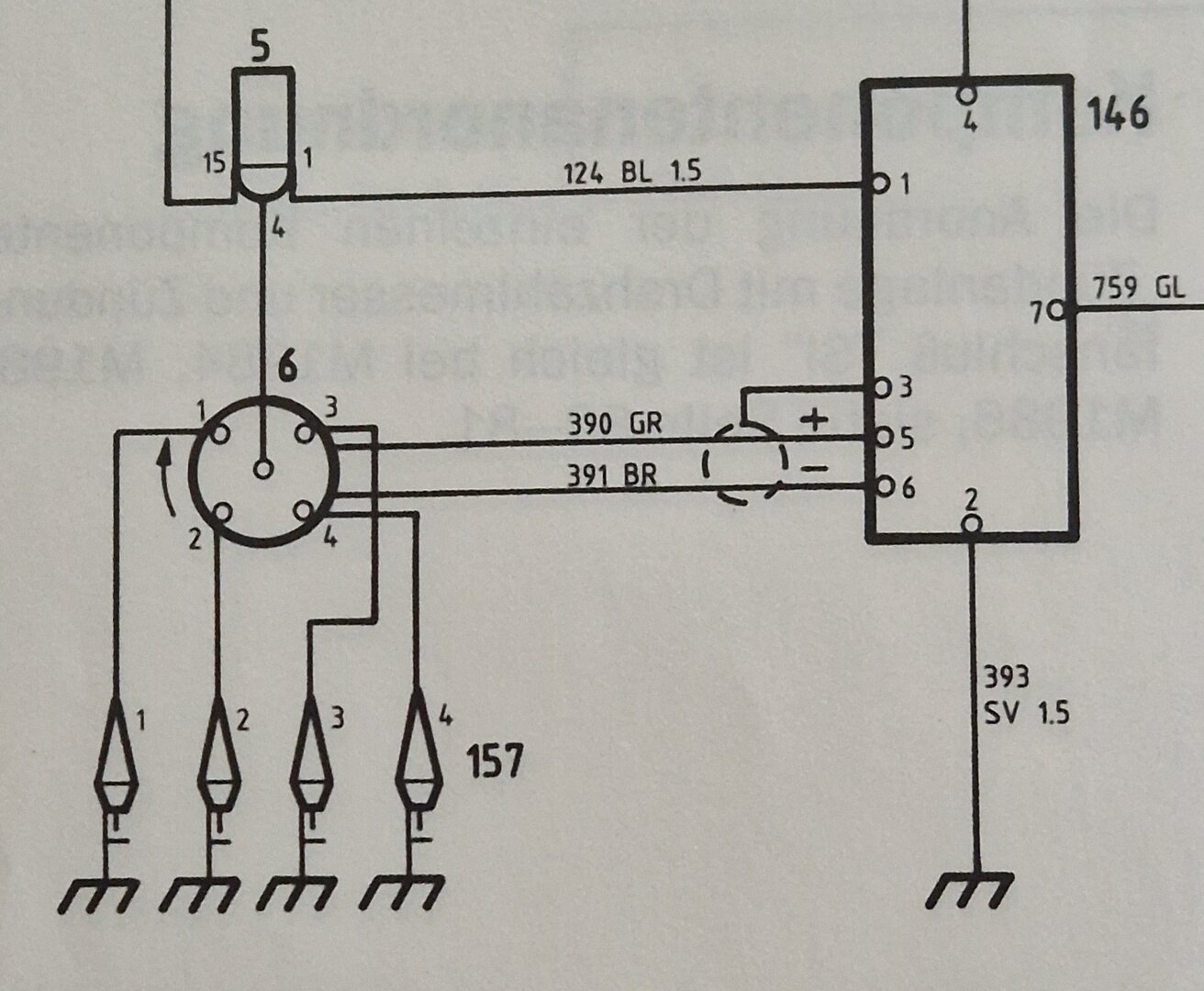 Moin, Stecker zum Hallgeber gibts hier: https://www.wagenteile.de/shop_de/905327211-flachkontaktgehaeuse-211905327.html Habe selbigen verbaut. Das ganze ist ab Werk mit einem zweiadrigen, geschirmten Kabel gelegt. Ob das notwendig ist kann ich nicht sagen, schaden wirds nicht. Im Schaltplan siehts so aus: Plus auf 5, minus auf 6, Null über Schirmung auf 3 Bei mir liegt allerdings: + auf Pin 5 - auf Pin 3 0 auf Pin 6 Hab das selber mal neu verkabelt und wohl 3 und 6 vertauscht. Funktioniert aber auch. Für optimale Schirmung wärs andersrum wohl besser. Alles MJ86, mit folgendem Darlington: Hier gibt es zu dem ganzen noch eine genauere Beschreibung: https://saab-cars.de/topic/50498-so-nun-ich-mit-nr-3-auch-hier/page/17/#findComment-1631743
