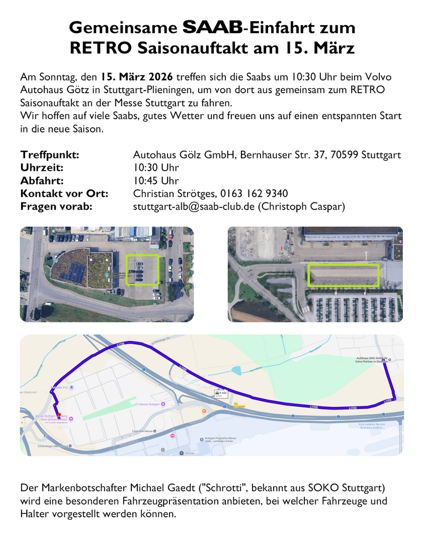 15.03.2026 - RETRO Saisonauftakt, SAAB-Einfahrt Treffpunkt 10:30 Uhr bei Autohaus Gölz, 11-16 Uhr, Messe Stuttgart in 70771 Leinfelden-Echterdingen 08.-12.04.2026 Retro Classics Essen, Messe Essen in 45131 Essen (Saab-Club Halle 5 Stand C10 ) 02.-03.05.2026 - Saabfesten 2026, 46138 Trollhättan, Schweden 08.-10.05.2026- ADAC Hockenheim Historic, Motodrom Hockenheim in 68766 Hockenheim (Saab-Club Stand) 30.05.2026 - 10. SAAB-Saturday, Landmaschinenmuseum Riesenbeck in 48477 Hörstel (Saab-Club) 04.-07.06.2026 - 26. Troll-Rallye der Saabfreunde Erftkreis, zur Fraenkischen Schweiz in 95349 Thurnau 12.-14.06.2026 - Klassikwelt Bodensee, Messe Friedrichshafen in 88046 Friedrichshafen 27.06.2026 - Saab Ausfahrt mit Picknick am Auerberg (Anmeldung notwendig) von Saab-Meets-Classics in 86975 Bernbeuren 20.06.2026 - Midsommar Grillen Stammtisch Stuttgart/Alb 26.-28.06.2026 - 6. Saab & Wine 2026, in 38-480 Rymanów, Polen 🇵🇱 05.07.2026 - Festival of Classic Cars 🏰🚘, Schloss Reichenschwand in 91244 Reichenschwand 19.07.2026 - Alte Schweden - Motortreff am Flugfeld der motorworld in 71034 Böblingen 07.-09.08.2026 - 40. IntSAAB 2026, Bro Park in 197 93 Bro, Schweden 🇸🇪 30.08.2026 - Heja Sverige. SAAB-Volvo-Treffen, Buochs Quai in 6374 Buochs, Schweiz 🇨🇭 05.-06.09.2026 - Hüttengaudi Allgäu (Anmeldung notwendig) von Saab-Meets-Classics in 87541 Bad Hindelang 19.09.2026 - Tom´s SAAB-TREFFEN 2026, 10 Uhr, Ausfahrt mit Treffpunkt beim Hotel-Gasthof Kramerwirt in 83737 Irschenberg 10.2026 - SAAB Session Slovakia 2026 in der Slowakei 🇸🇰 28.11.-06.12.2026 - Essen Motor Show, Messe Essen in 45131 Essen 28.11.2026 - SCHWEDEN POWER Volvo & Saab-Meet, ACE CAFE LUZERN in 6023 Rothenburg, Schweiz 🇨🇭 20.-21.02.2027 - 16. Saab Swiss Fondue Meeting in 1337 Vallorbe, Schweiz 🇨🇭 25.04.2027 - Tribut an Carl Benz 2027 (Fahrzeuge bis Modelljahr 1973) im Karlsruher Schloss in 76131 Karlsruhe 29.04.-02.05.2027 - Retro Classics, Messe Stuttgart in 70629 Stuttgart (Saab-Club Stand)