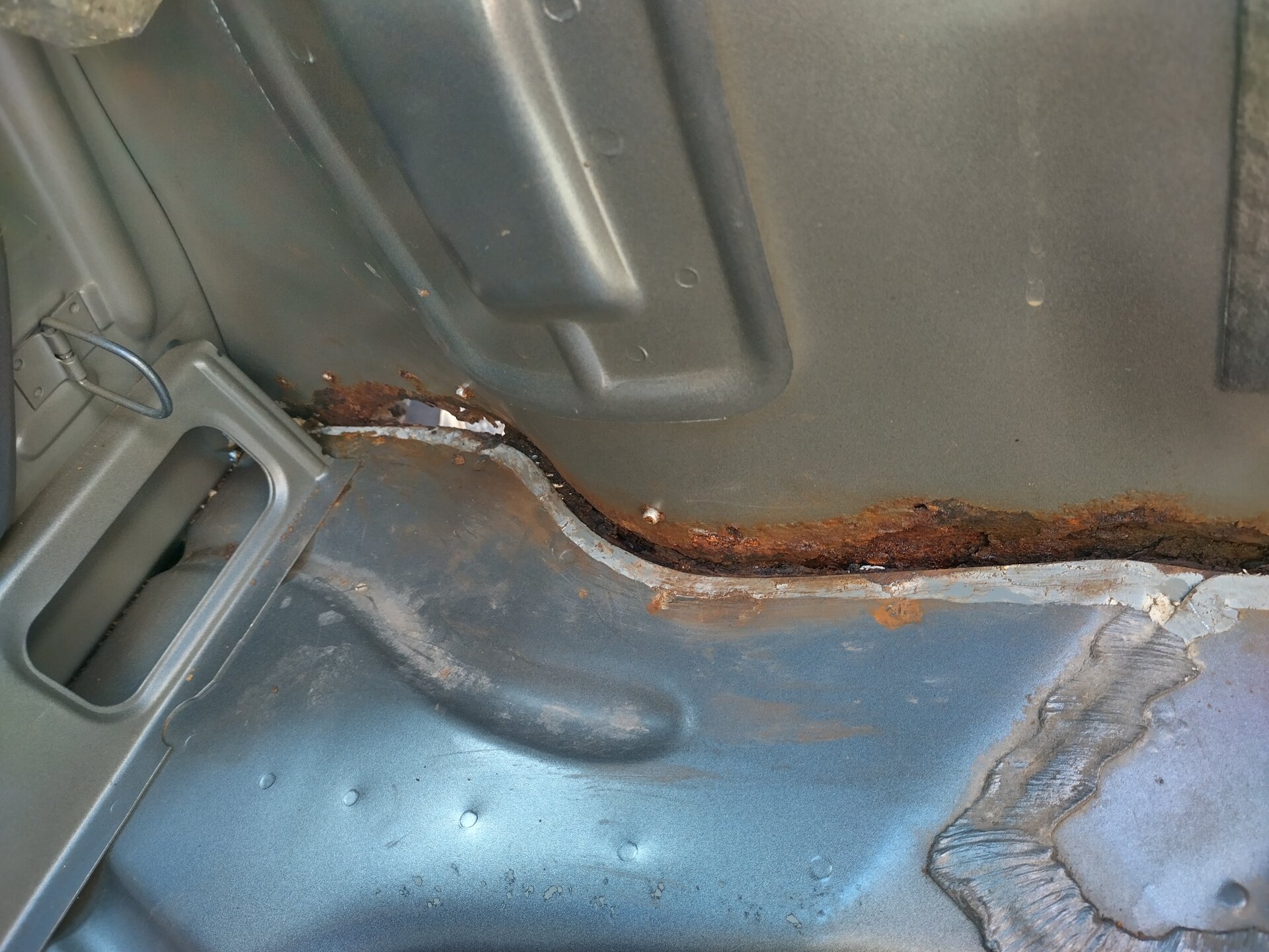 Hallo zusammen! Da ich am letzten Wochenende wieder eine typische Rosttelle am 9-3 I (3-/5-Türer) beheben mußte, habe ich dabei ein paar Fotos gemacht. Aufgefallen ist es, weil es im Kofferraum seitlich nass war. Der Teppichboden vom Kofferraum war dort tratschnass. Nachem ich dann zunächst den Teppich ausgebaut und die Seitenverkleidungen weg genommen habe, sah man dann das Grauen. Auf der Beifahrerseite war die komplette Kante vom Kofferraumbodenblech zur Radkastenwand von vorne bis hinten durchgerostet. Von der Radkastenseite her war dort ein Blechstreifen drüber gesetzt. Jemand (beim Vorbesitzer passiert) hat dort einfach einen Streifen Blech zugeschnitten, mit Dichtpampe drunter halbherzig rein genietet und außen nochmal mit Dichtmasse und Unterbodenschutz drüber gejaucht, so daß man es auf den ersten Blick gar nicht so genau sehen konnte. Zumal auf der Beifahrerseite noch der Tankeinfüllstutzen ein wenig die Sicht bedeckt.