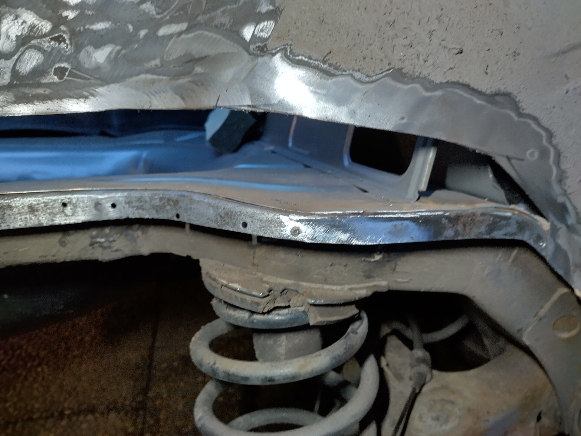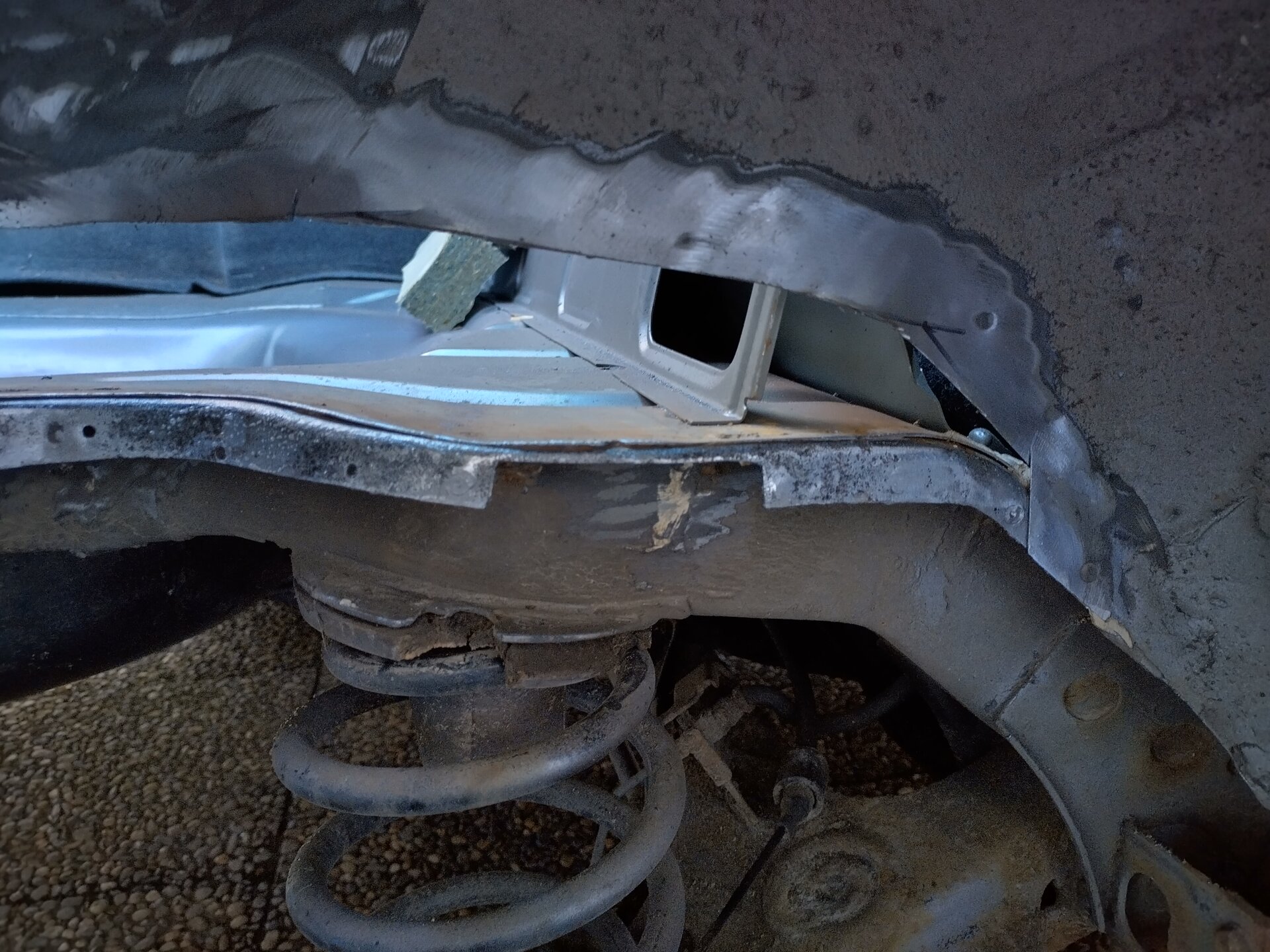 Nachdem die Kante dann noch mit Zinkspray-Primer behandelt war, habe ich das neue Stück Radkastenblech angefertigt. Das habe ich dann am Ende aus 2 Teilen gebaut, da es aus einem Teil am Stück doch etwas zu aufwändig geworden wäre. Soll ja auch passen. An der Unterkante wurde das Blech mit der Schweißpunktzange eingeschweißt. Der Rest mit Schutzgasschweißgerät. Nachdem die Nähte verschliffen waren habe ich das Blech noch mit 2k Epoxi-Primer grundiert und dann später noch mit Lack und Unterbodenschutz gespritzt. Das sollte dann hoffentlich für einige Jahre keine Sorgen mehr machen.