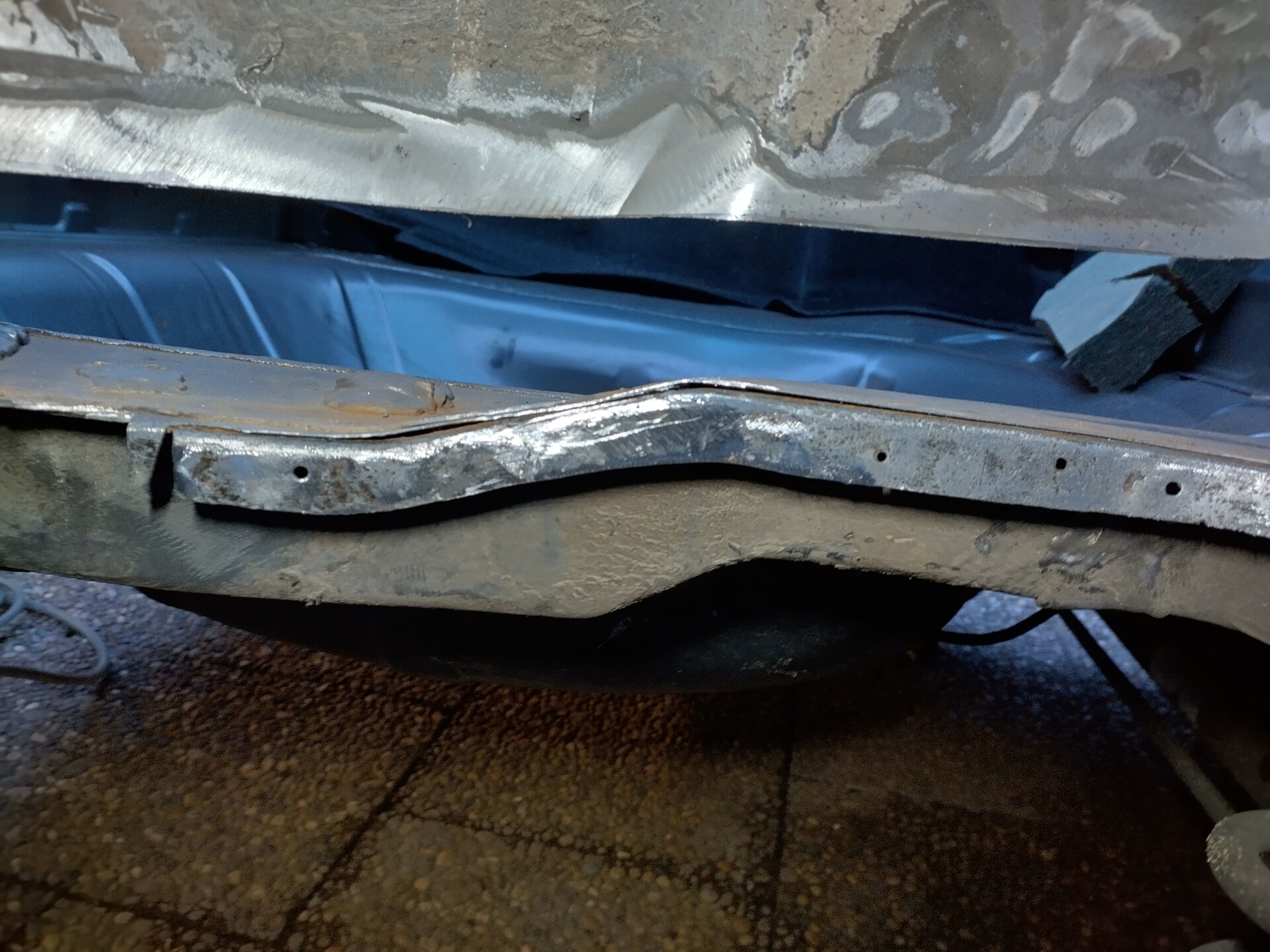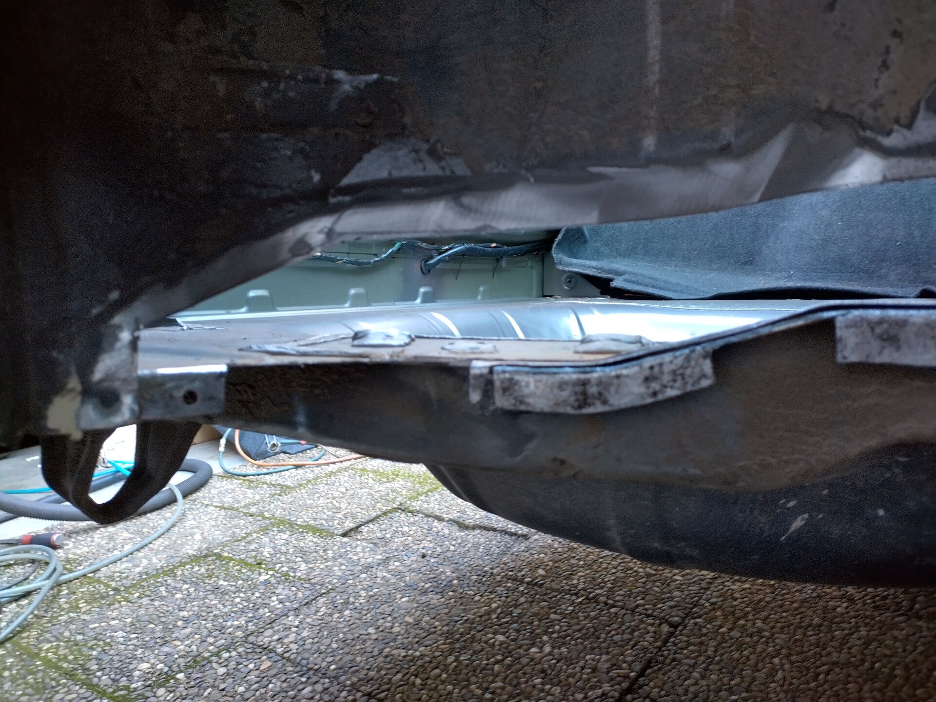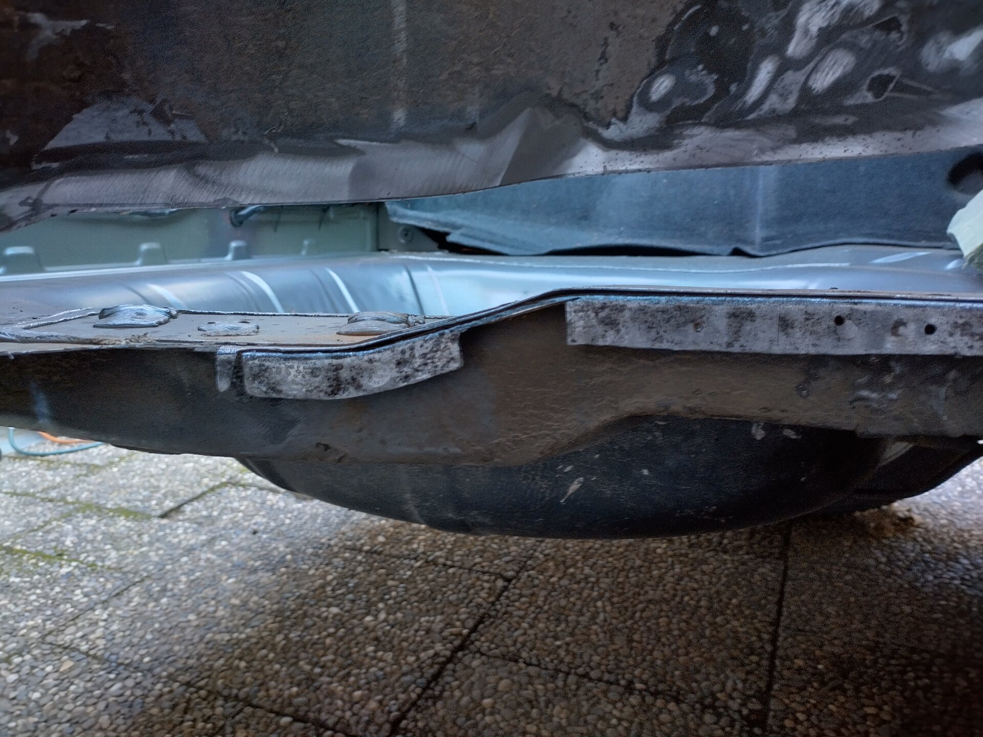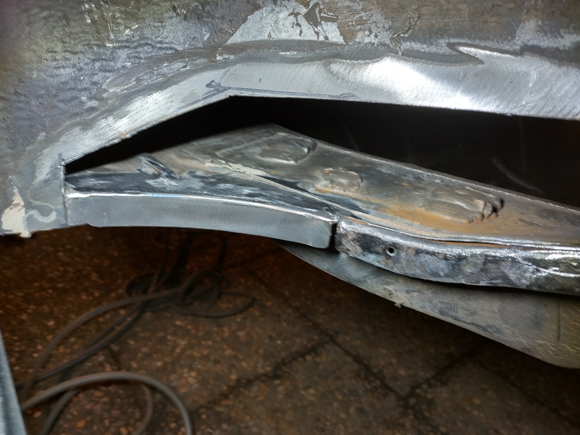 Oben alles auf Stoß, also 2. Ich habe das neue Blech zunächst etwas überlappend auf das alte aufgelegt und mit Cleco-Pins erstmal fixiert. Und dann Stück für Stück etwa mittig durch beide Bleche geschnitten. Egal wie krumm man das macht, es passt nach entfernen der abgeschnittenen, überlappenden Blechstreifen immer sehr gut. Auf Stoß schweißen geht sehr gut mit meinem Schweißgerät (Lorch M304). Da die Naht auch nicht unbedingt "schön" aussehen muß, habe ich auch nur wenig verschliffen und da nicht auf eine "glatte", unsichtbare Optik Wert gelegt. Innen ist der Teppich davor, und im Radkasten schaut man eh nicht hin.