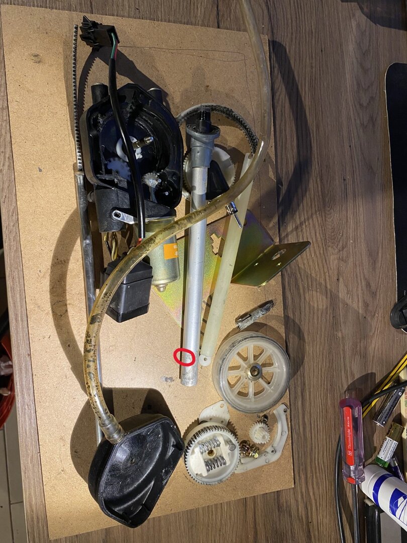 Vielleicht hilft es ja, aber ich hatte damals das gesamte Gehäuse zerlegen müssen, da dieses Plastik-/Nylonband am Antennenstab gebrochen war. Soweit ich mit erinnere, ließ sich das Rohr entfernen, nachdem ich die markierte Schraube entfernt hatte. Die fixiert das Rohr vermutlich zusätzlich. Man kann auch die Einkerbungen der Schraube erkennen. Edit: bei den skalierten Bildern kann man die Kerbe leider nicht mehr erkennen, daher hier noch gezoomt: