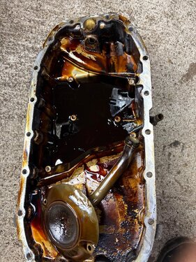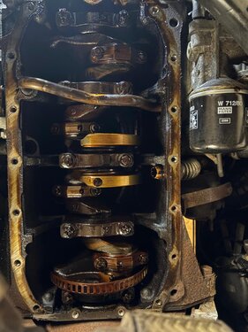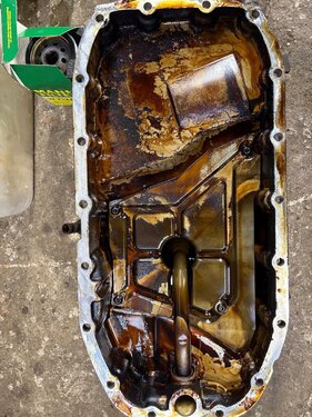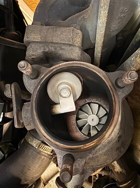 Ich habe gestern die Ölwanne meines 9-5 (Bj. 2003, 186kkm, nicht nachvollziehbare Servicehistorie von 2014 -2024 - aber wahrscheinlich eher minimalistisch serviciert) abgebaut. Schön ist was anderes, hätte aber mit noch mehr Ablagerungen am Ölsieb gerechnet. Er hat auch extrem an 3 Seiten der Ölwanne rausgesaabert . Alles gereinigt und mit Loctite 518 gedichtet, neue O-Ringe natürlich und bei der Gelegenheit das KGE-Update-Kit montiert. Foto von der Turbo-Abgasseite hab ich auch geschossen (warum ist der so weiß? Kein fühlbares Spiel!). Hab in Summe (inkl. Rauchpausen) dafür auf der Bühne aber doch 7h dafür gebraucht. 2 echt nervige Schrauben / Muttern gibt es da: die untere des Katrohrs zum Turbo hin und die Ölwannenschraube ganz hinten rechts. Die kann man nur mit dem Ringschlüssel mit 1/12.-Drehungen öffnen bzw. festziehen