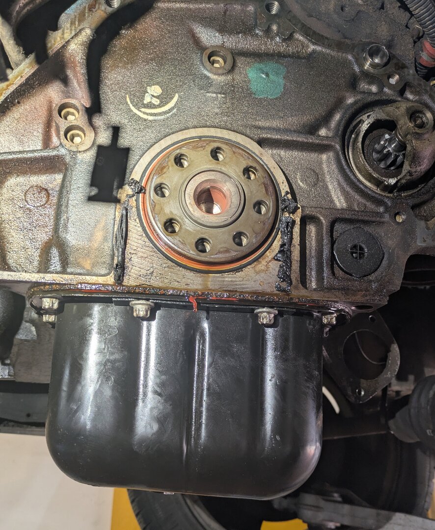 Den Gedanken hatte ich auch schon kurz, aber dafür müsste ich die Auftragfläche ölfrei bekommen. Denke auch von außen angebracht wird das wenig dichten. Thema ölfrei - so siehts aus, nachdem der Motor einmal warm lief (das Blech über dem Schwungrad rechts im Bild habe ich abgenommen, um ein mögliches Leck am KW-Dichtring zu sehen): Danke, dann sollte ich es ja auf einen Samstag auf der Bühne hinbekommen!