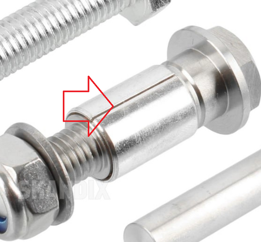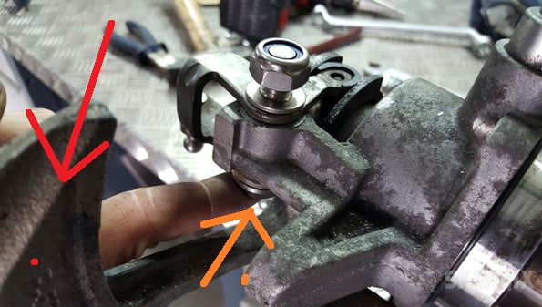 Das Teil, durch roten Pfeil gekennzeichnet. Ist im Weg, um mit dem Hammer aus der Richtung des orangenen Pfeils die Schraube durchzuschlagen. In der Skandix-Anleitung steht "Die neue Achse von der Seite des Kugelkopfes einstecken." Das hört sich für mich nach gewisser Leichtgängigkeit an. Bei mir ging es nur mit allergrößter Kraft. Und ja, ich habe die Nylonreste korrekt entfernt und alles gesäubert.