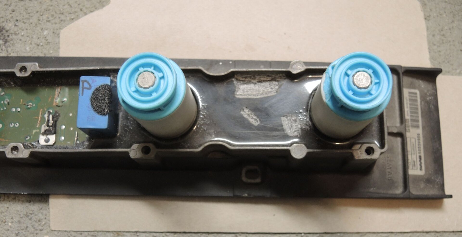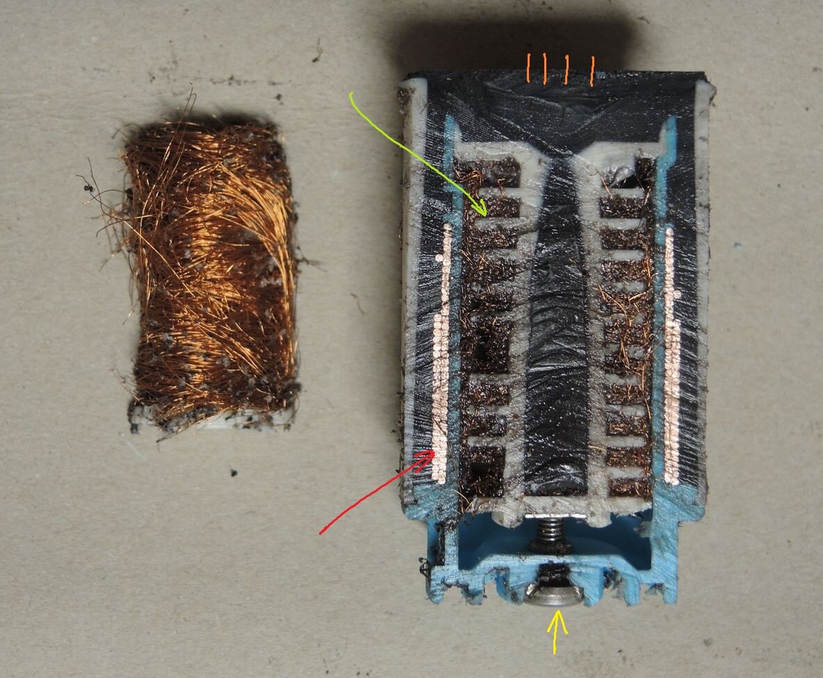 So, das ganze hat mit keine Ruhe gelassen. Da ich gerade eine (schwarze) zerstörte DI liegen habe, hab ich mal etwas weiter gemacht. Schön vergossen. Über 100°C ist das Zeug nicht mehr ganz so spröde, dann spritzen die Splitter nicht so doll. Was den Aufbau und Verguss angeht und damit auch die Möglichkeit da was zu reparieren dürften sich sich rot und schwarz nichts tun. Auf der Oberseite (hier ja die Unterseite) geht es in SMD weiter. Zur eigentlichen Zündspule. die 4 orangen Striche sollten die Anschlüsse zur Platine symbolisieren. Roter Pfeil: die dicken Drähte der Primärwicklung. Vollständig eingegossen in den schwarzen Kunststoff. Gelber Pfeil: Da drückt die Feder drauf, die im Rüssel sitzt und den Kontakt zur Zündkerze herstellt. Grüner Pfeil: Ja, das ist die Kammer mit den Windungen der Sekundärwicklung. Und die Sekundärwicklung ist vollständig mit Öl getränkt. Aber so eng wie das gepackt ist sollte sich da gar nichts bewegen. Da haben Bläschen keine Chance. Beim Aufsägen hat es einige Windungen raus gezogen. Hab hier gerade keine Möglichkeit das zu hobeln. Ach und die Spule lag waagerecht dabei. Aus den leeren Kammern ist also kein Öl ausgelaufen. Nur das was mit den feinen Drähten am Sägeblatt raus kam.