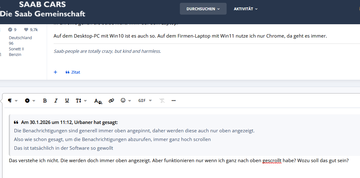 Moin seit einer Weile ist mir aufgefallen, dass die Glocke zwar eine rote Nummer hat, ich die aber nicht anklicken kann. Insbesondere wenn ich über die Liste zu einem Beitrag gesprungen bin. Eben ist mit aufgefallen, dass hier am Rechner unter Firefox (147.0.1, 147.0.2) alle Buttons und Links oben ein der dunklen Titelleiste (Durchsuchen, Aktivität, Glocke,..) nicht mehr funktionieren wenn ich in einem Thread bin. Auf der Startseite oder einem Forenbereich funktionieren sie. Hab nur ich dieses Phänomen? CU Flemming