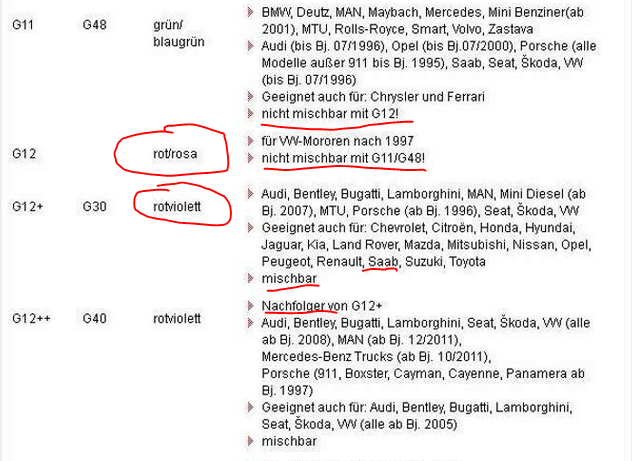 Wenn ich die von @Holofernes gepostete Rechnung richtig lese, sind in den Kosten weit mehr Arbeiten als die neue ZKD enthalten. Nur den Betrag zu lesen führt daher in die Irre. Und zur Kühlflüssigkeit: 1. wenn jetzt die ZKD neu kommt, gehe ich mal davon aus, daß man das Kühlsystem auch spült und neu befüllt. Dann ist das reale oder angenommene Problem einer Misch-Befüllung eh weg. 2. bei der Bezeichnung der Farben von G12 und/oder G12+ kann es schon mal zu Ungenauigkeiten kommen. G12+ (und auch G12++) kann man mit anderer Flüssigkeit mischen, und an sich paßt G12+/G12++ ff auch ohne weiteres zum NG 900 .... Siehe auch: https://www.teclub.com/de/shop/kuhlmittel/kuhlmittelkonzentrat-g12-g12/ Das es grundsätzlich besser ist, nur eine Sorte im Kühlsystem zu haben, ist dabei auch klar. Pauschal findet man in den üblichen Listen z.B. auch bei LiquiMoli stets die pauschale Ausage/Empfehlung: KFS 11 (LiquiMoli) = G 11 (VW) = G48 (BASF) KFS 12+ (LM) = G12+ (VW) = G34 / G30 (BASF) Ich habe in meinem MY 95 NG900 auch vor dem Winter mit G12+ aufgefüllt.