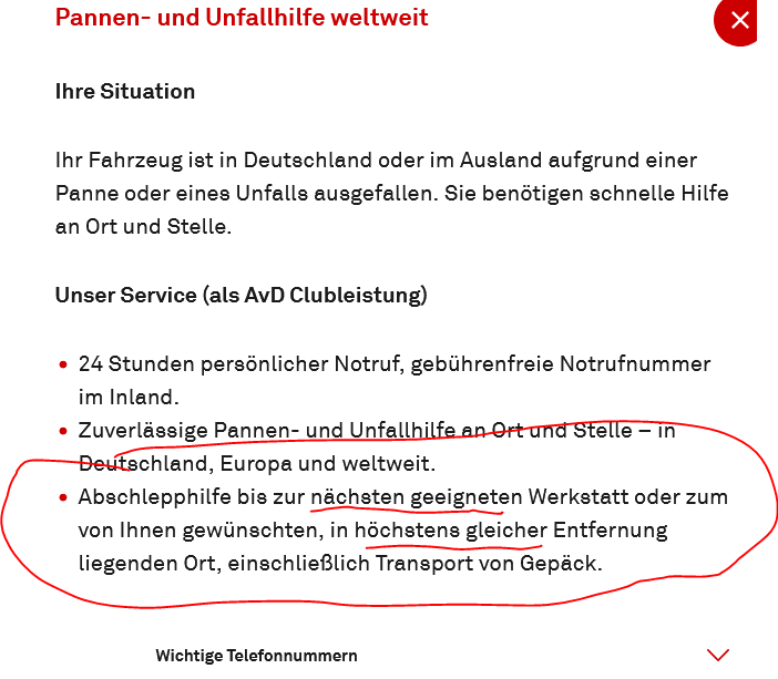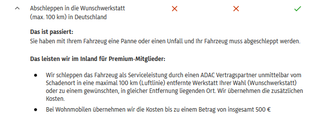 Ja, deshalb ist der AvD bei mir auch raus aus der Wahl. Da steht in den Bedingungen: Ich habe keine Lust, mit der Pannenhilfe diskutieren zu wollen, was bei einem Saab (bei mir zwischen 30-40 Jahre alt) geeignet ist oder nicht. Andere Anbieter sind da flexibler mit konkreten Angaben wie "Wunschwerkstatt im Radius von 25 km oder sogar 50 km". Das ist für mich eines der wichtigsten Kriterien. Beim ADAC ist es inzwischen übrigens auch so, und deshalb habe ich da auch gekündigt. Erst bei der Premiummitgliedschaft (139,- Euro/Jahr) gibt es die Möglichkeit des Abschleppens zur Wunschwerkstatt, dann immerhin bis 100 km Entfernung). Aktueller Favorit bei mir ist der BAVC mit dem EURO-Tarif für 84,50 Euro. Enthalten ist das Abschleppen in Wunschwerkstatt (D) bis 50 km. @saab-wisher der AcE bietet "Wunschwerkstatt" aber auch erst ab dem Tarif "Komfort" an und dann auch nur bis 30 km Entfernung.