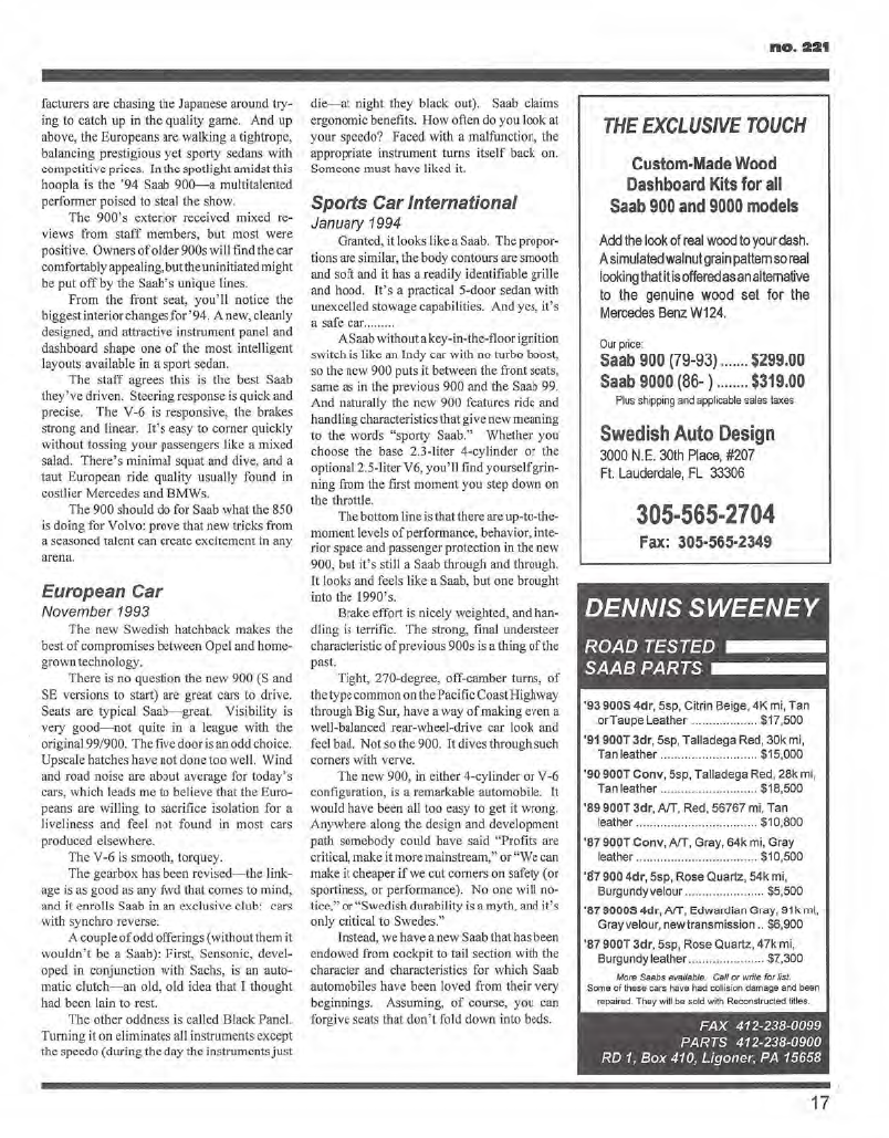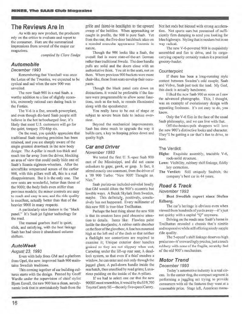 Eine Fundstelle aus dem Internet: eine Zusammenstellung von Meinungen amerikanischer Auto-Tester zum Launch des NG 900 (entnommen der NINES, der Mitgliederzeitung des US Saab Clubs 1994):