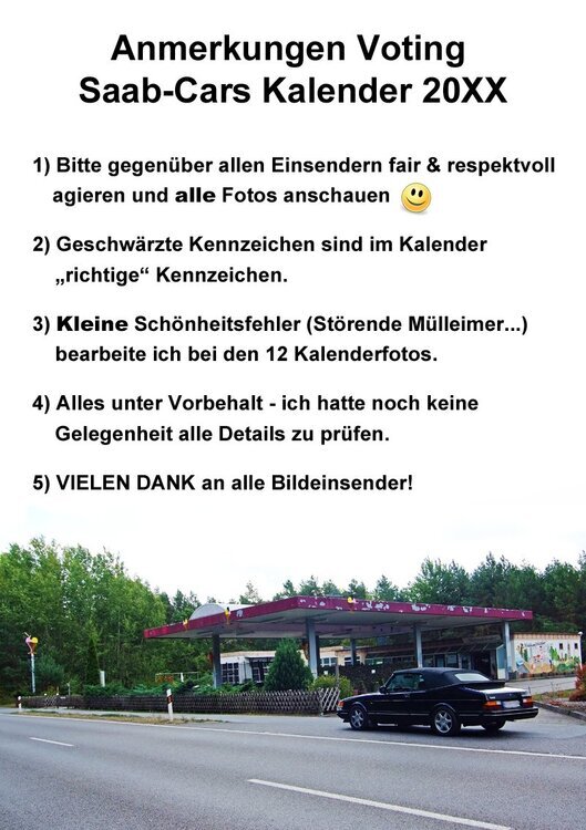 #neue_mailadresse_siehe_unten #dateinamen_bitte_mit_usernickname_versehen #rest_wie_gehabt Hallo Und jedes Jahr grüßen die Kalender....wo ist denn meine Trommel?...Ah hier: Allgemein bekannt: meine Zeit ist begrenzt, dieses Jahr bin ich wieder auf maximale Flexibilität und Unterstützung durch euch angewiesen, allerdings sollte es etwas entspannter als voriges Jahr sein. Bitte achtet selber auf vollständige Angaben und auch daran untereinander an die Aktion zu erinnern. Dieses Jahr würde ich gerne nun wirklich mal wieder eine Laborüberraschung auf die Beine stellen. Wer daran interessiert ist, bitte kurz per PN melden. Im Topf ist noch das Geld vom vergangenem Jahr, es war zeitlich dann schlichtweg nicht mehr machbar. Aber das nehmen wir als gesunde Basis für dieses Jahr. Nun aber zu den Einsendungen: Jeder darf insgesamt 4 Fotos einreichen, für 2 Kalender, also pro Kalender 2 Fotos. 2 Stück für den gemischten Votingkalender, 2 Stück für den beliebten S/W Kalender, für den es allerdings seit Jahren zu wenige Bildeinsendungen gibt! Bitte die Dateien klar & deutlich kennzeichnen. Weil es mir unglaublich viel Arbeit spart: Username bitte in jedem Dateinamen mit angeben - danke. Bildtitel ist mit anzugeben. Bitte einfach eine Minute nachdenken & einen Titel dazu schreiben - danke. Folgende Fahrzeugdaten bitte mit angeben: Baujahr, genaue Typbezeichnung. Der Rest wie gehabt: Wichtige Eckdaten für alle denen die Aktion nicht vertraut ist: Alle Einsender erklären mit der Teilnahme daß alle Bildrechte uneingeschränkt beim jeweiligen Teilnehmer liegen - also ganz wichtig: Die Bildrechte müssen bei euch selber liegen! Sollte das nicht der Fall sein, bitte Einverständniserklärung des Urhebers / der abgebildeten Person(en) mitsenden. Kurz zur Erklärung: Sich die Frage stellen ob man das Foto selber angefertigt hat. Wenn ja: alles ist gut & passt. Wenn nein, ist der Urheber des Fotos zu Rate zu ziehen (der, der den Auslöser gedrückt hat). Alle Einsender erklären sich bei Teilnahme mit der Veröffentlichung der Fotos für das Voting und im Kalender einverstanden. Alle Einsender erklären sich damit einverstanden das die Aufnahmen ggf. für die Tassenaktion (betrifft nach dem Voting nur den best gevoteten "Neusaab" & den bestgevoteten "Altsaab") verwendet werden. Eingereichte Fotos müssen im Querformat vorliegen! Möglichst hohe Auflösung -> 3000 x 2000 Pixel und mehr dürfen es gern sein, bitte keine 600kb kleinen VGA Bildchen einsenden. Mögliche Formate: JPG, TIFF, PNG (ohne Transparenz) Möglichst keine Handyfotos, außer sie sind gut genug für das Format 30x45cm. Im Zweifel entscheide ich, gilt auch für Aufnahmen von "richtigen Kameras" die wenig Pixel oder eine hohe Kompression aufweisen. Aber bevor zu wenig Fotos eingereicht werden und da die Handykameras ja immer besser werden: einfach mal einreichen, sofern von einem halbwegs aktuellem Handy aufgenommen Kurzfassung: Je Einreicher max 2 Bilder fürs Voting + 2 extra gekennzeichnete Fotos für den Fall dass mir noch was Schönes einfällt. Es kann ja nicht schaden wieder einen S/W Kalender anzupeilen. Ihr sendet die Aufnahmen bitte mit folgenden Informationen: Betreff: Saab Cars Kalender 2026 - Forennickname (Bitte unbedingt Nickname im Betreff angeben!) Forumsaccount: ERFORDERLICH! Name: OPTIONAL! Gewünschte Bildunterschrift im Kalender: bitte unbedingt Bildunterschrift für alle Aufnahmen angeben (welcher Titel zu welchem Bild gehört sollte auch ersichtlich sein) Fahrzeugkennzeichen im Kalender: abgeändert oder original Fahrzeugdaten: Baujahr, genaue Typbezeichnung Eindeutige Kennzeichnung welches Foto für welchen Kalender gedacht ist. Username bitte in jedem Dateinamen mit angeben - danke. Ich erkläre mich wieder bereit bei den Fotos die in den Kalender kommen auf Wunsch die Kennzeichen abzuändern, also in z.B. SA-AB 901 oder ähnlich abzuändern, also nicht einfach nur weiß oder schwarz drauf. Ausserdem würde ich bei den 12 Kalenderaufnahmen wieder Kleinigkeiten retuschieren. Das werde ich allerdings nicht bei allen eingesendeten Fotos fürs Voting machen. Wer sein Kennzeichen im Voting auch geschwärzt haben möchte, bitte selber dafür sorgen, mir aber unbedingt das Original mitschicken damit ich davon ausgehend die Bearbeitung machen kann. Vor einigen Jahren wurden 2 Fotos in den Kalender gevotet, bei denen eine massive Nachbearbeitung wegen ungünstiger Fahrzeugpositionierung notwendig war. Die Fahrzeuge wären ohne Bearbeitung unter dem Kalendarium verschwunden. Da nehme ich mir dieses Jahr das Recht heraus so etwas vor Votingbeginn von der Teilnahme auszuschließen. Betroffene erhalten natürlich Zeit eine andere Aufnahme noch einzusenden. Wird niemand dadurch benachteiligt. Hier nun die Adresse der Fotosammelstelle: saabkalender [ääääät] tutanota.de (maximal 20 MB pro Mail) oder einen Downloadlink mitschicken. Bitte keine Fotos in Threads einstellen, keine Fotos via PN schicken. Falls irgendwo zufällig schöne Aufnahmen irgendwo (z.B. in der Galerie) gesichtet werden, dürft Ihr natürlich gerne an die Kalenderaktion erinnern. Die Bildersammelstelle schließt dieses Jahr ungewöhnlich früh und an einem Samstag am 27.September 23:59:59 Uhr. Danach ist die Sammelstelle geschlossen & bleibt es auch. Voting wird voraussichtlich nur eine Woche andauern. Falls Fotos nicht den Kriterien entsprechen kommt eine Mail zurück. Ich sortiere lediglich nach den Kriterien (Format, hohe Auflösung, eventuelle Urheberrechts- oder Persönlichkeitsrechtsverletzungen, ungünstig für das Seitenverhältnis im Kalender). Möglicherweise ergibt sich dann im Testprint das ein gevotetes Bild auf dem großen Format doch nicht gut wird und ausgetauscht werden muß. Wenn im Voting Fotos fehlen ohne dass eine Nachricht von mir gekommen ist, bitte sofort bei mir melden. Vielleicht machen wir ja auch wieder ein Softopening. Wer bei der technischen Umsetzung (S/W Umwandlung, Schnitt usw.) Probleme hat, bitte kurze präzise 