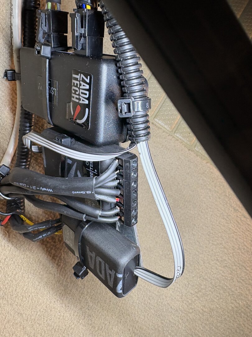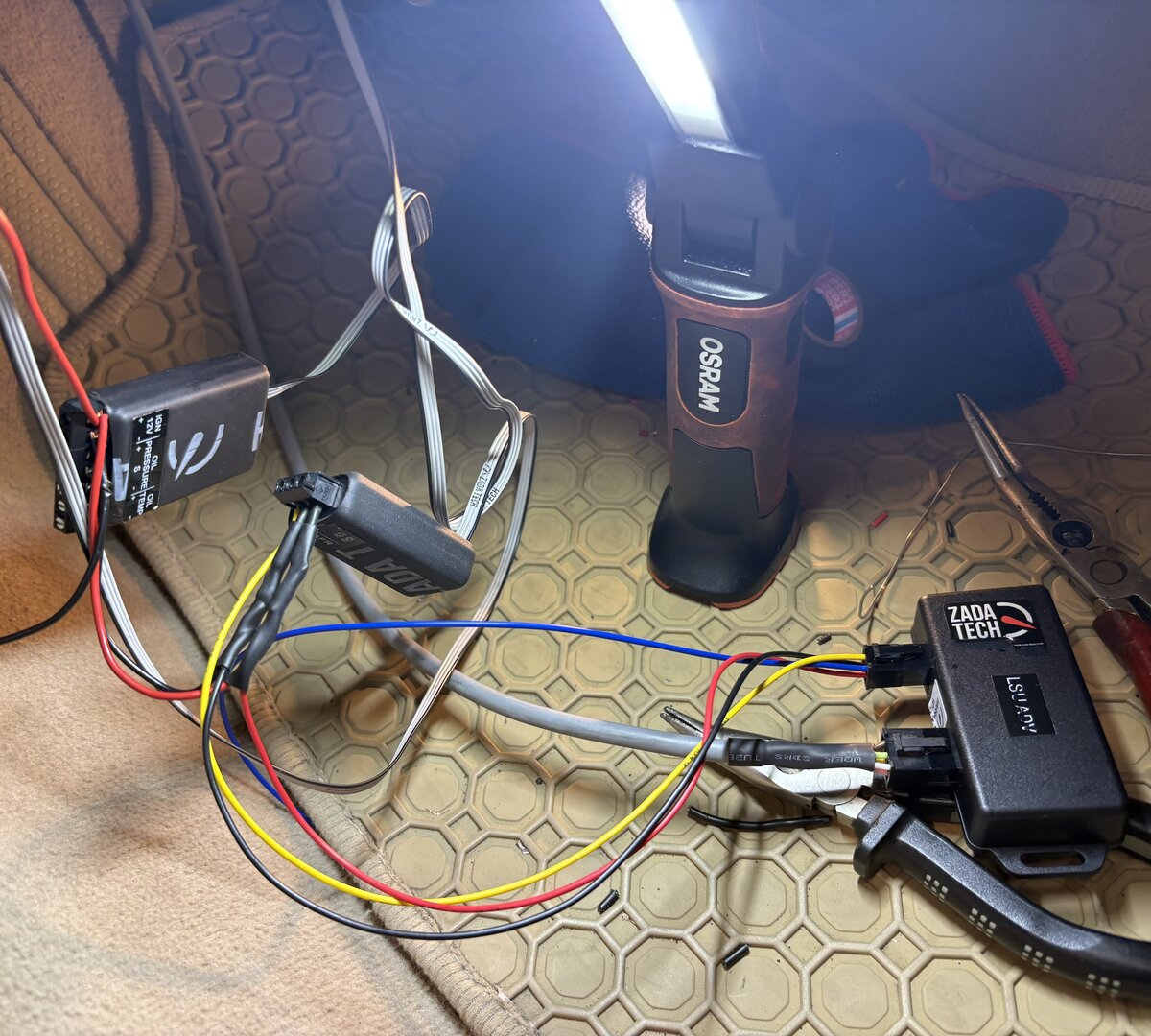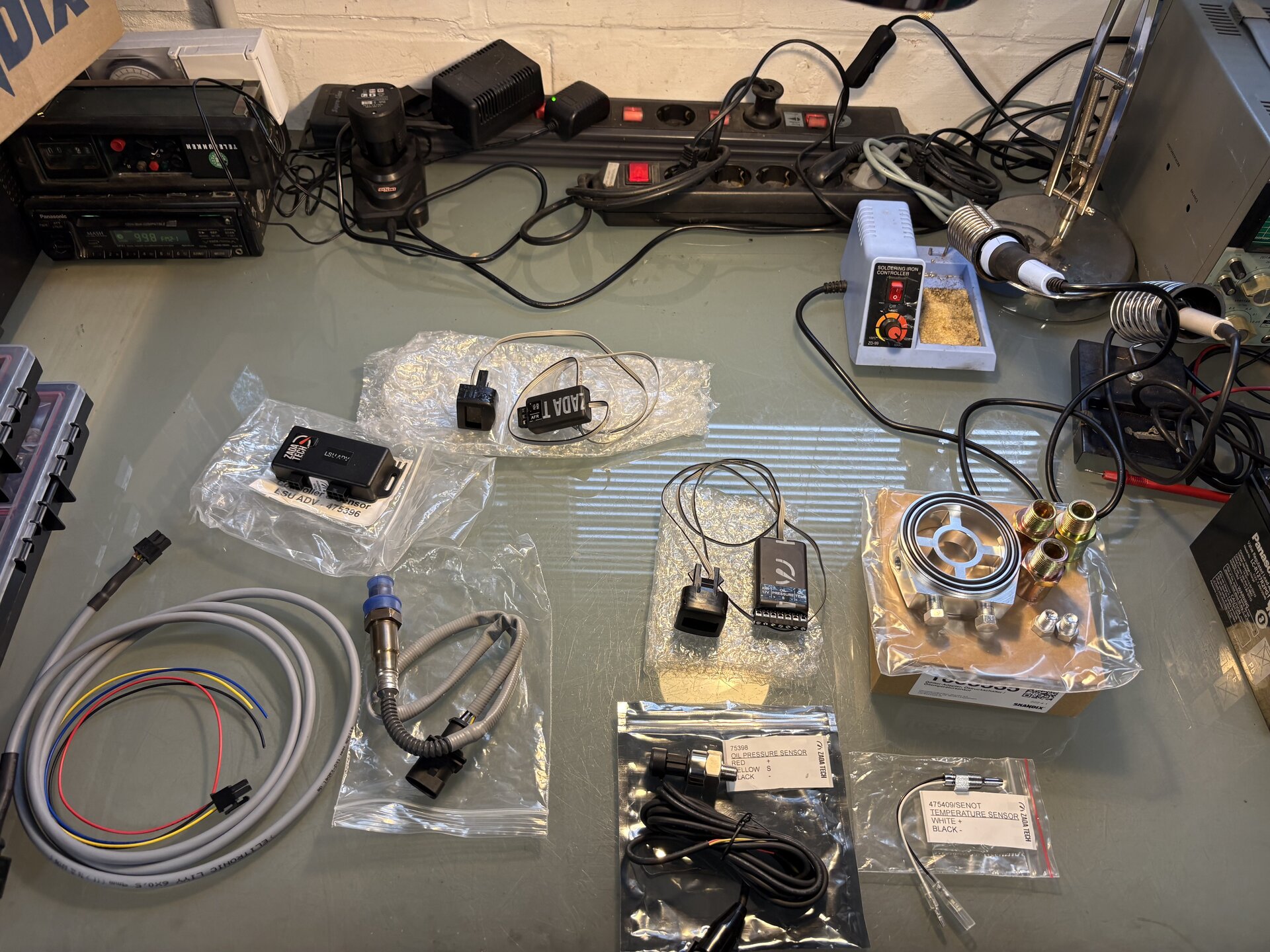 Öldruck, Öltemp, AFR verkabelt. Jetzt muss noch die Lambda-Sonde in das Kat-Gehäuse, dann bin ich gespannt auf die Werte. Die drei Zada-Tech Steuergeräte habe ich auf eine Lochplatte aus Metall mit Kabelbindern fixiert. Hinter dem Armaturenbrett ist super viel Platz und man kann die ganze Mess-Einheit dort gut und sicher befestigen. Zum Austritt in den Motorraum habe ich den vorgezeichneten Durchbruch für die Kupplung genutzt, bei meinem Automatikwagen bot sich das an. Die Verschlusschrauben und Geber sind konisch, vielleicht war das Teflon-Band unnötig.