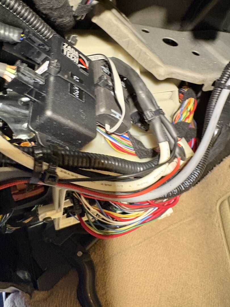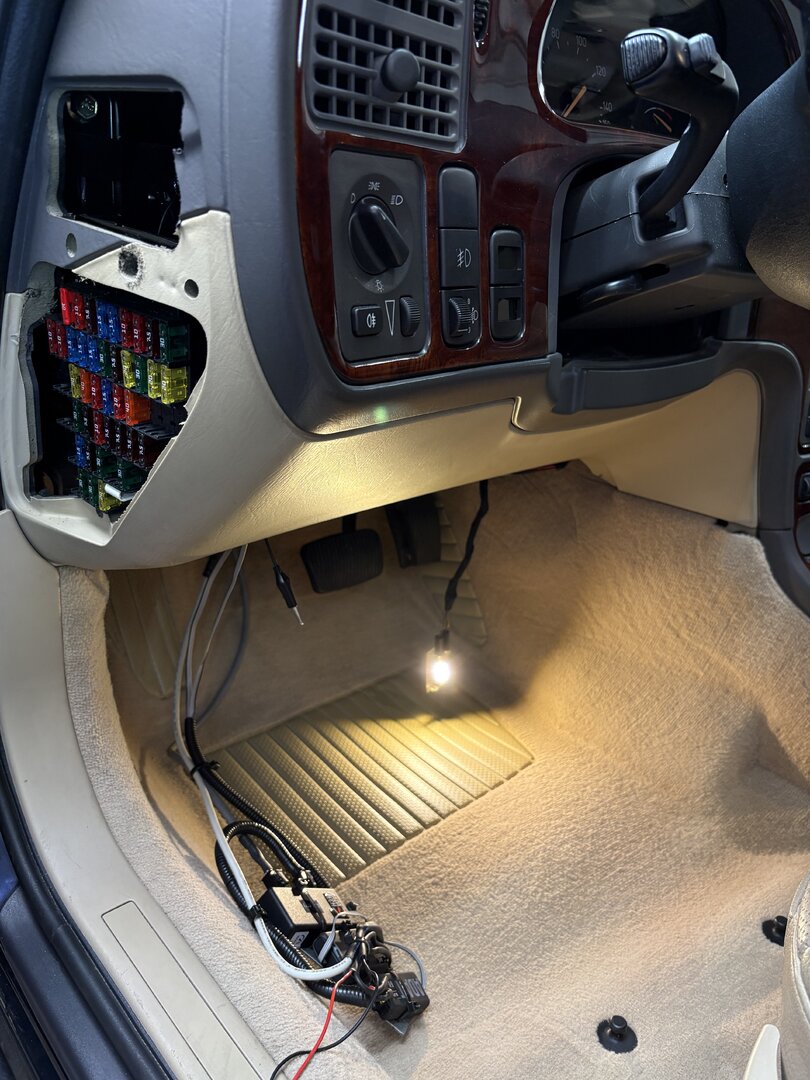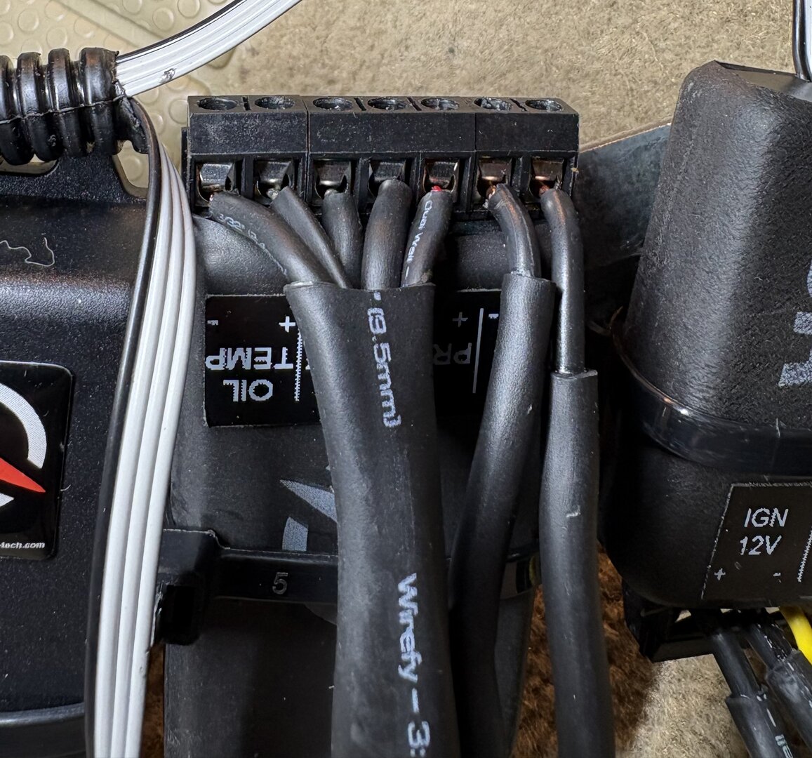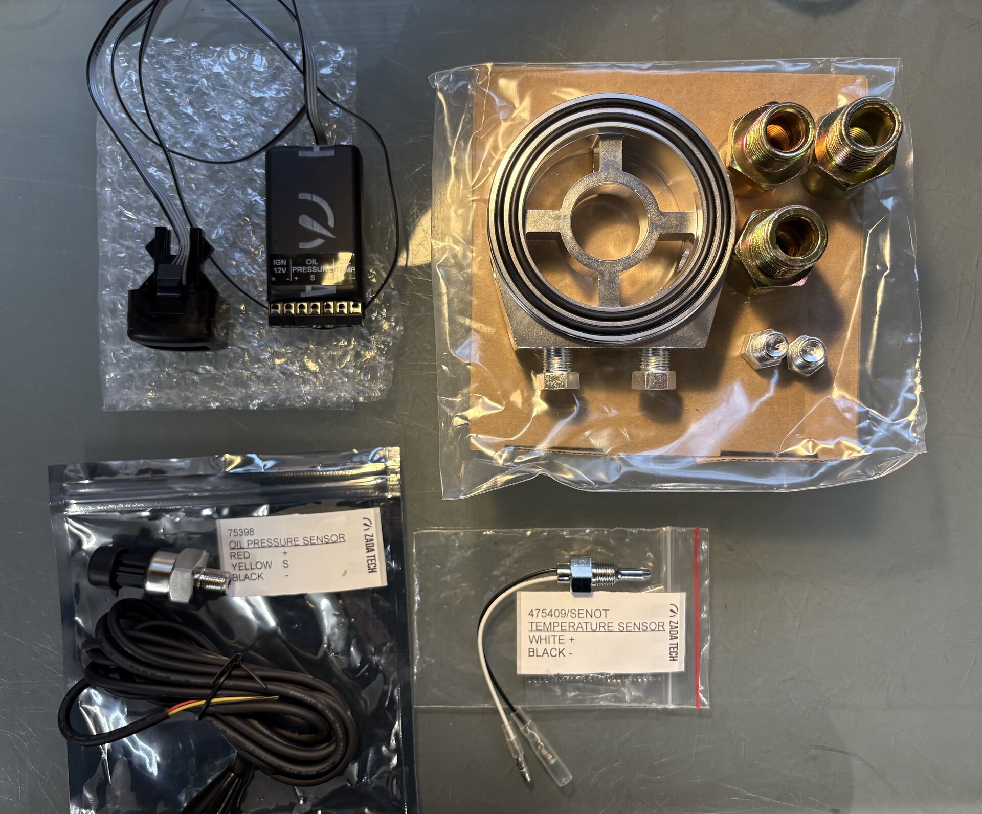 Öldruck, Öltemp, AFR verkabelt. Jetzt muss noch die Lambda-Sonde in das Kat-Gehäuse, dann bin ich gespannt auf die Werte. Die drei Zada-Tech Steuergeräte habe ich auf eine Lochplatte aus Metall mit Kabelbindern fixiert. Hinter dem Armaturenbrett ist super viel Platz und man kann die ganze Mess-Einheit dort gut und sicher befestigen. Zum Austritt in den Motorraum habe ich den vorgezeichneten Durchbruch für die Kupplung genutzt, bei meinem Automatikwagen bot sich das an. Die Verschlusschrauben und Geber sind konisch, vielleicht war das Teflon-Band unnötig.