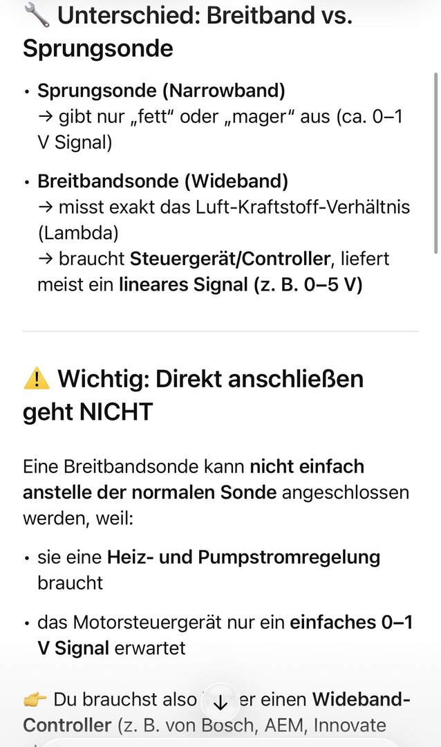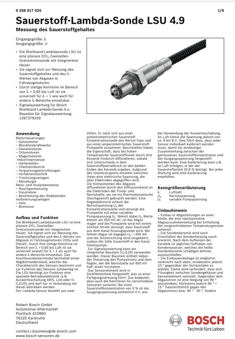 Ich habe 2 Händler angefragt - sie raten mir vom Controller ab. Ich habe keine Erfahrung damit, nur schon 2x Breitband Sonden verbaut (Bosch LSU 4.9, bei meinen alten 900/I Turbo zur Gemischüberwachung). Meine Lösung wird so sein : ich bohre ein Loch in das Kat-Gehäuse, dann wird eine abgeschrägte Einschweissmuttter angebracht. Das wird gehen - weil der Keramik-Anteil erst ca. 15 cm tiefer im Gehöuse beginnt. Der Kat bleibt also völlig heile. Die Sonde ist eine moderne LSU ASV Sonde die keine freie Luft Kalibration mehr braucht Bosch ADV_pre_Turbo.pdf zadatechwidebandafr.pdf