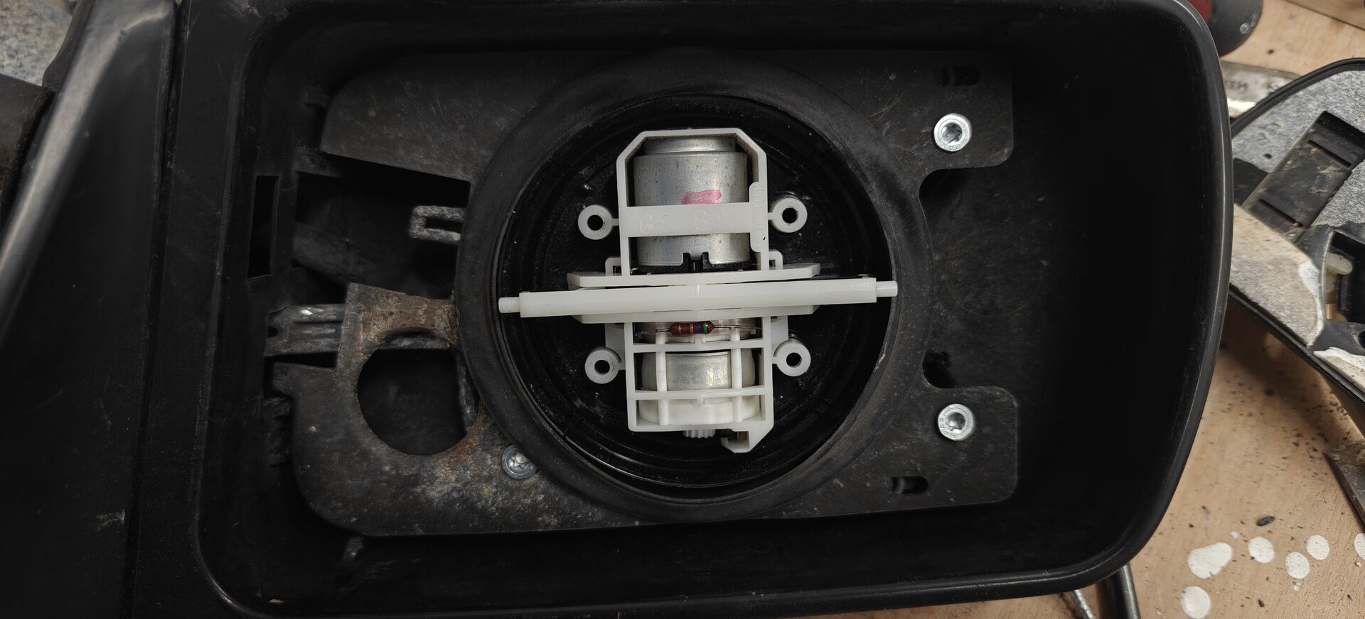 Ich möchte das hier mal selbst nach 4 Jahren auflösen. Der Spiegel wackelte mittlerweile so sehr, daẞ man echt nichts mehr sehen konnte. Daher habe ich einen guten strammen gebrauchten besorgt und montiert. Da die Spiegel ja nicht mehr nachwachsen und immer seltener werden, habe ich mich auf "Spurensuche" begeben und bin fündig geworden. Über dem Zug Element sitzt ein Blech, das in dem die Federn hinten eingegangen sind dieses war über der Strebe die vom Zugelement zur Konsole geht mit der Zeit immer höher gebogen, das Blech soll diese Strebe jedoch herunterdrücken. Vorgehensweise: Spiegelglas runter, dann den Spiegelträger von den Motoren trennen. Die 4 Schrauben des Motors lösen den Motor hochheben. Die 4 verschweißten Kunststoffhalter "anbohren", stattdessen je 3mm Bohrungen in die Stützen bohren (für eine spätere Verschraubung). Den Motor durch die Öffnung nach hinten ausfädeln, das Blech entnehmen und richten, lieber etwas weiter. Dann Zusammenbau in umgekehrter Reihenfolge, das Blech habe ich mit VA Schrauben 4,2x16 anstelle der Verschweißung verschraubt. Ergebnis, der Spiegel wartet super gespannt auf einen weiteren Einsatz.