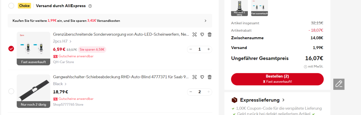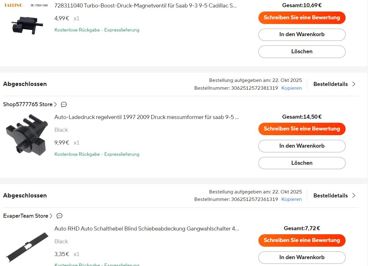 nö...passt schon. Die Chinesen haben gerade die 11.11. Week, da werden solche Dinger von verschiedenen Anbietern fürn Appel und ein Ei rausgeworfen....allerdins endet diese Woche dann am 19.11. und die Lampe ist derzeit für diesen Preis nicht erhältlich. Wahrscheinlich nach dem 19.11. dann wieder für um die 7 € das Stück. Hier mal ein funktionierendes Angebot https://de.aliexpress.com/item/1005010251502080.html? 2 Stück H7 LED ink Versand für 16 € Die Jalousie hatte ich noch im Warenkorb. Habe diese Tatsächlich vor paar Wochen für knapp 8 € bekommen. Kann man ja mal dahaben... Habe dann noch ein paar andere Sachen für den Saab gekauft.
