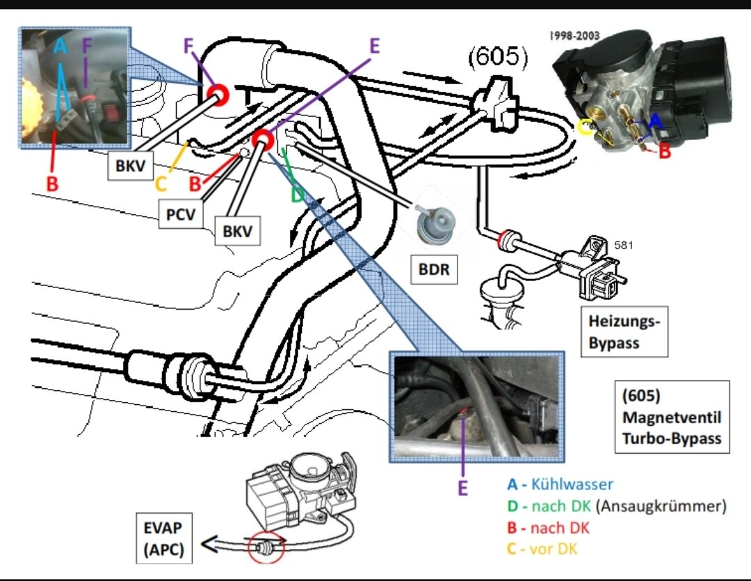 B235 R MY 2004 Automat Beim letzten Motorwechsel habe ich einen kompletten Motor mit Getriebe in meinem Saab gebaut. Läuft auch soweit alles ganz gut. Und ja: ich habe nahezu sämtliche Threads zum Fehler P1110 gelesen, dennoch aber einige Fragen, weil manches mir nicht klar ist, bzw die Threads im nirgendwo ohne Fehlerlösung beendet wurden. Folgendes: ich kann hunderte Kilometer fahren und die MKL bleibt aus. Irgendwann geht aus heiteren Himmel die MKL an- mit der Fehlermeldung P1110. Hier mit nen OBD Tester ausgelesen. Dieses Problem hatte ich auch schon beim alten Motor. Gleichzeitig gibt es die Problematik, dass ich problemlos an den roten Turbobereich fahren kann und die volle Leistung habe. Manchmal wiederum geht das eben nicht. Dann bekomme ich im oberen Bereich ein starkes Rucken (würde meinen : Fuelcut) und die MKL geht an. Kann aber ganz normal weiterfahren. Nun habe ich am WE das kleine Magnetventil, welches unter dem Zentralstecker an der Spritzwand ausgetauscht . (welcher Idiot bei Saab meinte: das muss unbedingt aufs Blech genietet werden?) Das neue wird geklipst. Wenn ich es richtig interpretiere, gibt es wohl noch ein baugleiches(?) unterhalb dieses Ventils - irgendwo an der Heizung? Mich irritiert die Zeichnung völlig. Irgendwie sehen die Ventile anders aus. Ich habe das Ventil wie folgt angeschlossen: Stecker abgewandte Seite geht an die Drosselklappe. Die im rechten Winkel abstehende Leitung in Richtung Bypass Turbolader Steckerseitig mittels T Stück , zum einen an die Drosselklappe und zum anderen in Richtung Heizung. Also schon so wie hier abgebildet: Was mich jetzt bissel stutzig macht: beim Anschluss "F" ist bei mir nichts. Ich kann P1110 jederzeit löschen und irgendwann kommt er wieder. Kann es sein, dass mit "fehlerhaftes Ladeluft Bypass Ventil" das APC Ventil gemeint ist? Also das , wo die 3 Schläuche in Rtg Turbolader gehen? oder ist gar das Bypass Turbolader Ventil gemeint? Das allerdings hat keinen elektrischen Anschluss. Es macht mich alle, dass die Ventile beim Saab alle irgendwie gleich klingen. Da ist ein Übersetzungsfehler geradezu normal. Es muss doch irgendwie möglich sein, den Fehler P1110 loszuwerden.