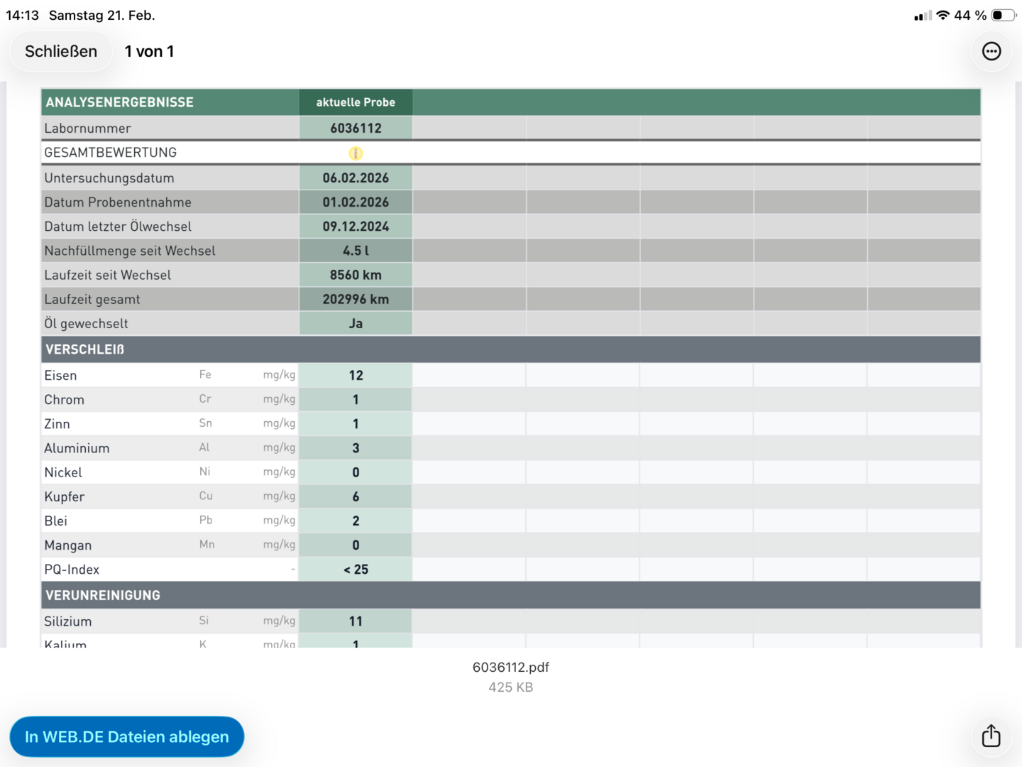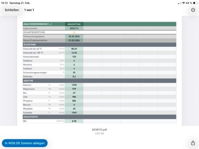 Im Februar 2026 habe ich bei KM -Stand 203.000 nach ca. 8.500km mit dem Castrol 10W40 mal eine Ölanalyse machen lassen: Allgemein wurde ein etwas erhöhter Benzinanteil im Öl angemerkt, das könnte allerdings daher rühren, dass ich vor dem Ölwechsel in der Kälte nur knapp 15km gefahren bin. Außer, das alles OK zu sein scheint, fehlen mir die Interpretationskünste der Profis, gerne darf das Ergebnis hier kommentiert werden :