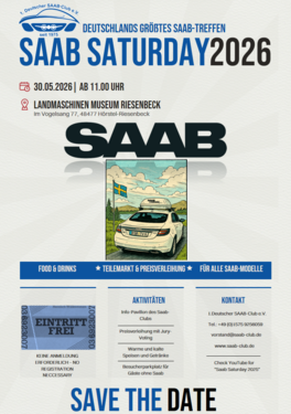 Hallo zusammen, Das offizielle Club Meeting des 1.Deutschen Saab-Club e.V. findet am 30.Mai 2026 statt. Alle wichtigen Infos könnt ihr dem Flyer entnehmen Selbstverständlich für ALLE Saab-Freunde, ob Mitglied oder nicht. Ob Saab 92 oder 9-5NG ist auch ganz egal, Hauptsache Spaß an der Marke. Parkmöglichkeiten für Gäste ohne Saab ebenfalls vorhanden. Gerne helfen wir, falls Hotelzimmer, Campingplätze etc. benötigt werden. Wir freuen uns ganz besonders auf Saab-Fahrer/innen die es bisher noch nicht zu uns geschafft haben. Für Anreisende am Freitag, 29.05. werden wir wieder ein Pre-Meeting organisieren. Bei weiteren Fragen, einfach melden