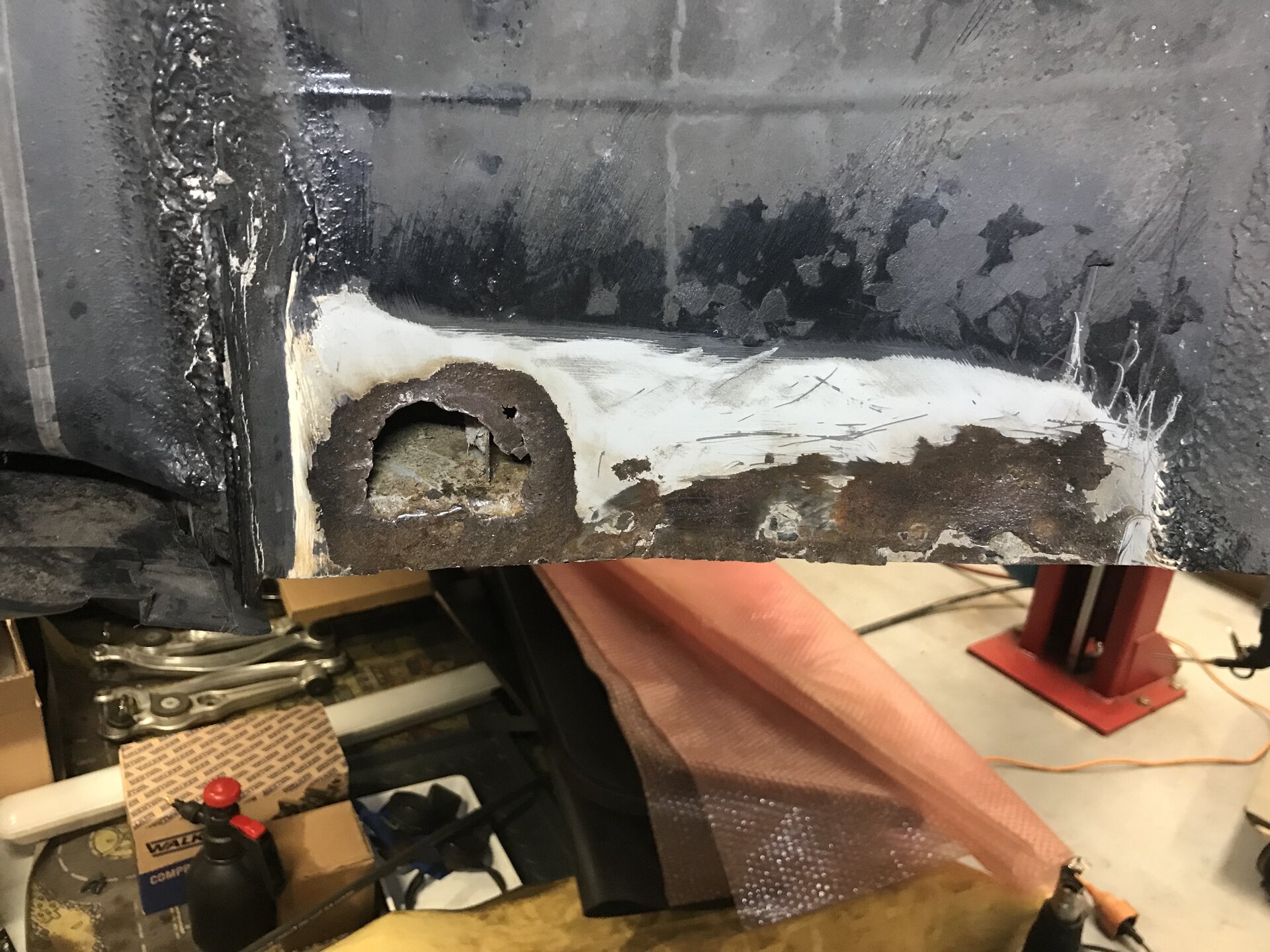 Motor raus sonst wirst du da im Motorraum nicht rankommen. Bei mir im 900 II war es auf der Beifahrerseite. Zum Glück nicht nicht durchgerostet. Großflächig angerostet auch unter den Fugendichtungen die ich abkratzen musste. Wasser kommt durch die Radhausdurchführung läuft dann den Träger runter vermischt sich mit dem Jahrelangen Dreck. Habe alle Nahtdichtungen entfernt. So gut es ging den Rost abgeschliffen und mit Brunox konserviert. Neue Nahtdichtung gezogen. Abschließend Branto Korux aus der Spraydose und dann lackiert.