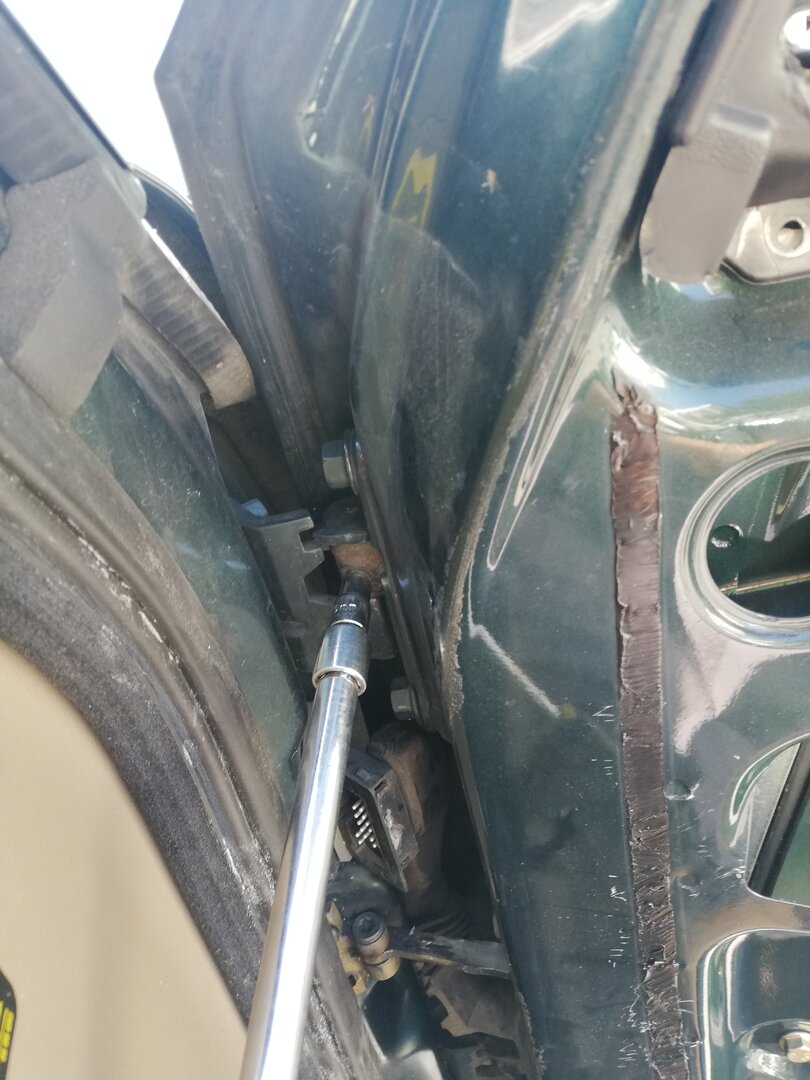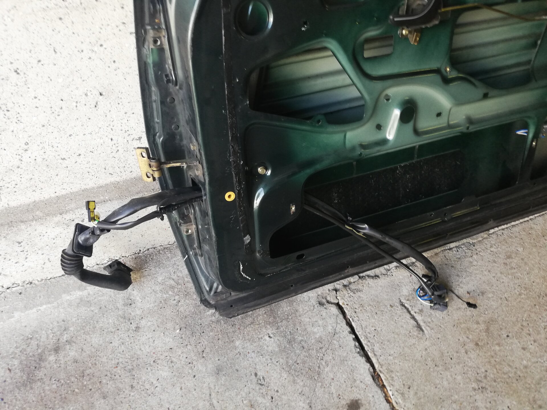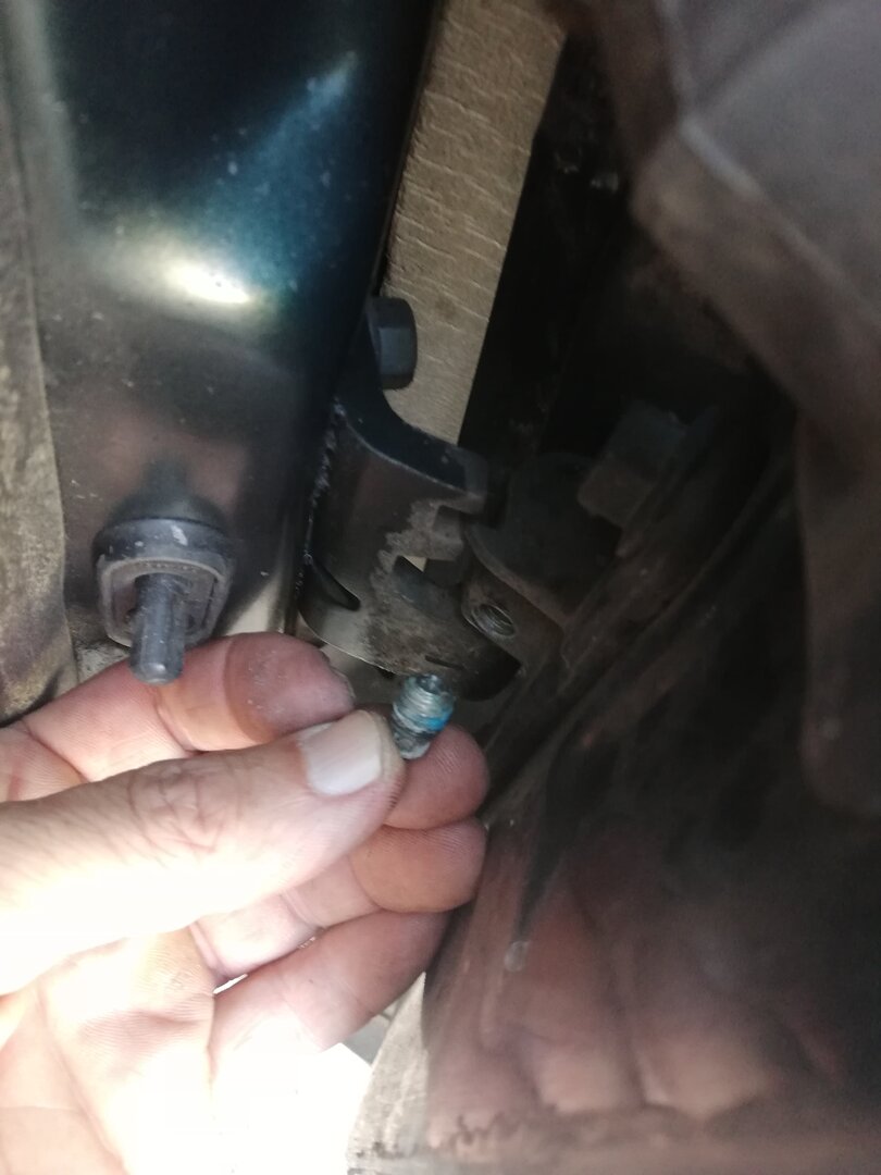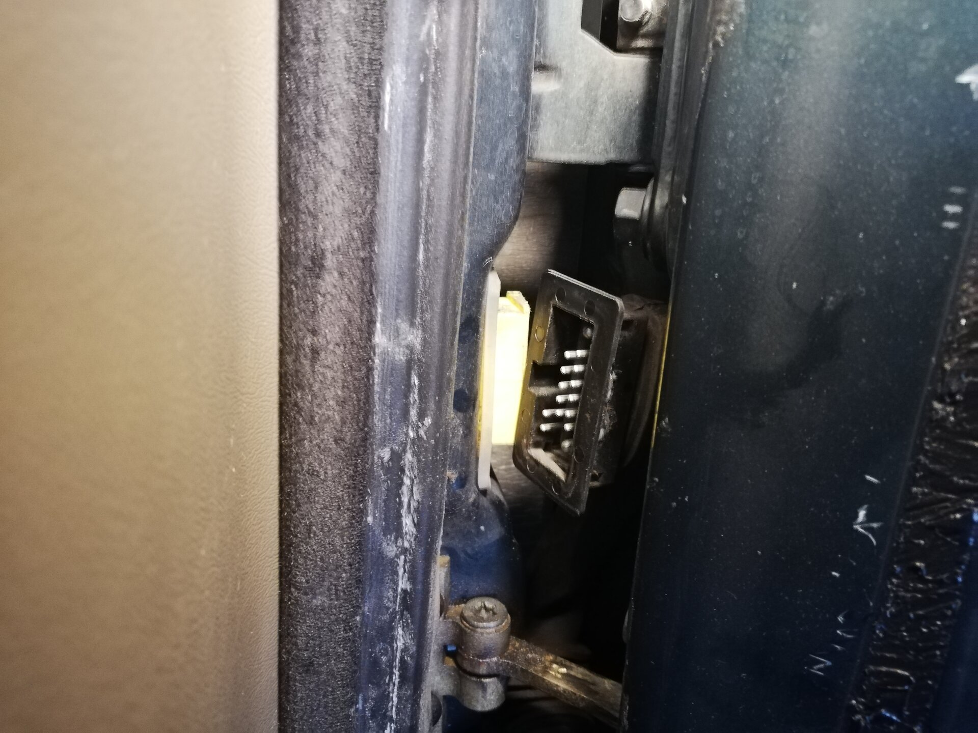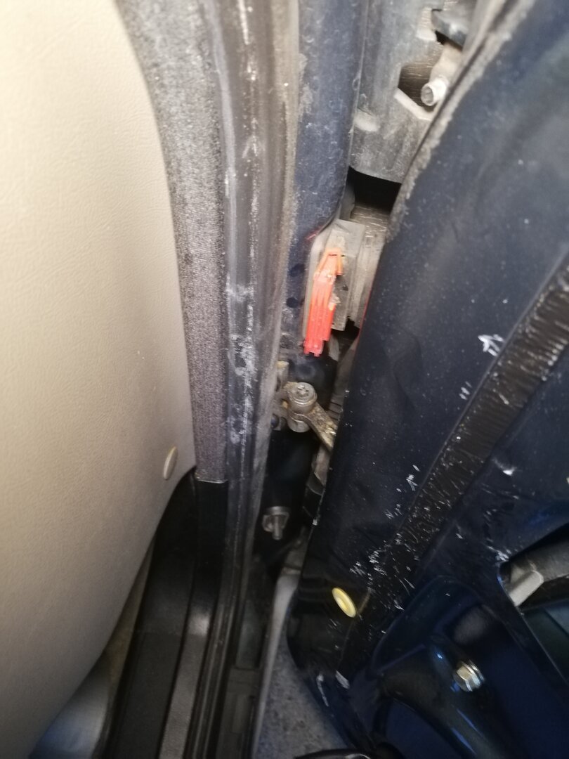 Schritt 4 Ausbau der Türe Dazu muss man die Türe komplett öffnen. Wer wie ich in einer schmalen Garage schraubt, muss jetzt einen Blick aufs Wetter werfen ;-) Tatsächlich geht das aber ziemlich einfach. Wenn man die Türe voll öffnet, kann man den Tür-Kabelbaum trennen. Der Stecker ist mit einer einfachen Kunststoff-Klammer gesichert (das rote Ding): Wenn die Klammer heraus ist, kann man den Stecker abziehen. Dabei aufpassen, dass sich das Gegenstück nicht in die A-Säule verkrümelt. Ist zwar eigentlich größer als das Loch, aber mit etwas Pech und Verkanten kann man es evtl. versehentlich versenken. Jetzt kann man noch den Türfänger lösen, der direkt drunter sitzt. Ich habe dazu einfach die Verschraubung an der A-Säule gelöst, denn die Ersatz-Türe kam glücklicherweise mit diesem Teil Jetzt muss nur noch diese Sicherungs-Schraube raus: Hier im Detail: Die Tür ist nun völlig frei. So weit öffnen, dass der "Kamm" richtig steht, und man eine Lücke hat: Jetzt einfach nach oben ziehen. Dazu kann ganz schön Kraft vonnöten sein. Das gibt dann gerne ruckartig nach, und man hat die Tür in der Hand (ich würde sagen, wiegt so um die 20 Kg) Nun kann man noch den Kabelbaum entnehmen, und bei Bedarf Scharniere etc demontieren und an die Ersatztüre schrauben: Fertig :)