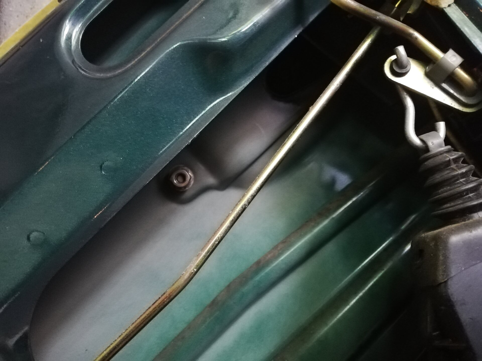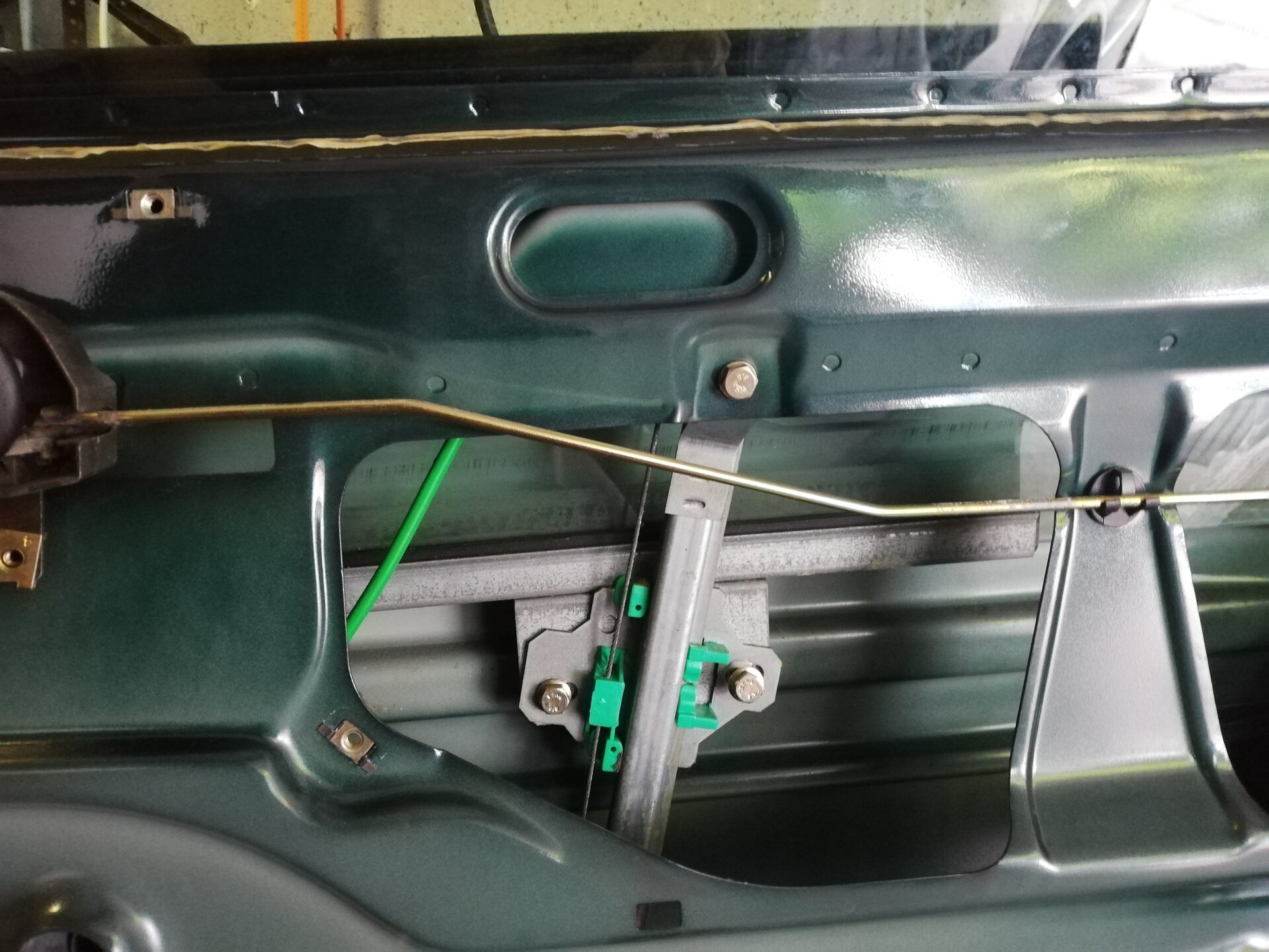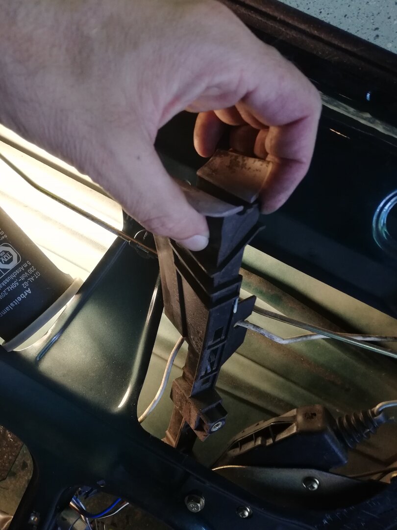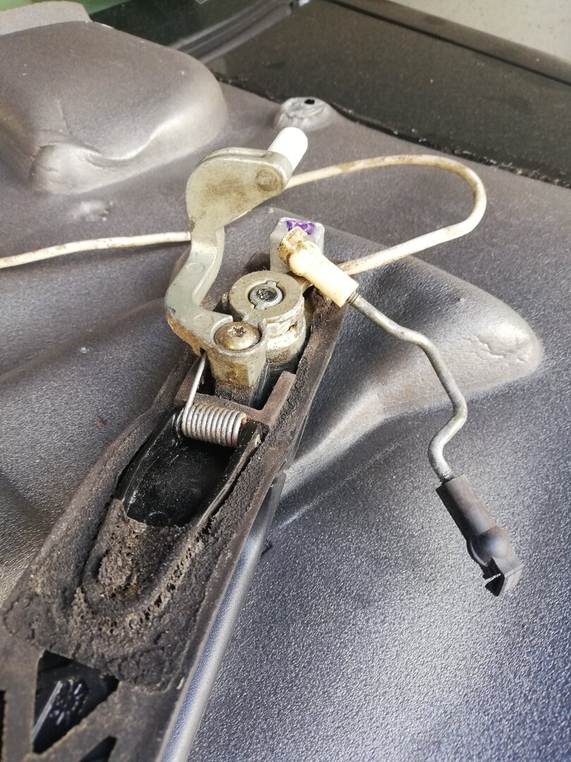 Schritt 3, Demontage Fensterheber Ich habe das Fenster auf halbe Höhe gefahren, dann kommt man gut an die Schrauben, mit denen das Fenster befestigt ist: Wenn die Schrauben gelöst sind, Schlitten nach unten fahren, dann Scheibe mit etwas nach vorne kippen aus der Türe heben. Das geht alleine, es schadet aber nicht, Hilfe zu haben. Jetzt sind die Gleitschienen (hinten) dran. Die Schrauben sind unterhalb der Schloßfalle, da hab ich leider erst nach dem Ausbau ein Foto gemacht: Und raus damit :) Rechts unten im Bild ist der Motor der ZV. Der ist als nächstes dran ...ist tatsächlich einfach mit zwei Schrauben fest. Dann kann man den Haken aushängen: Jetzt ist der Türgriff dran. In meinem Fall konnte die Schloßfalle selbst in der Tür bleiben. Das kann man trennen, indem man eine kleine Klammer an deme Kopf der Betätigungs-Stange öffnet. Tatsächlich ist der Türgriff nur mit einer Schraube befestigt. Löst man diese, kann man den Griff verschieben und dann aus dem Blech herausschwenken. Hier noch mal der ganze ausgebaute Türgriff: Damit ist die Tür "leer" und bereit für den Ausbau.