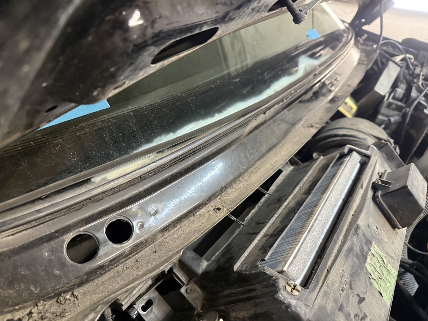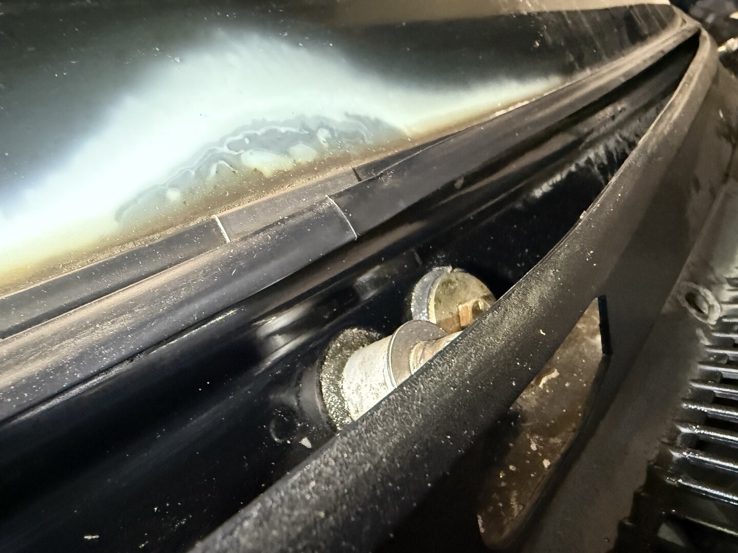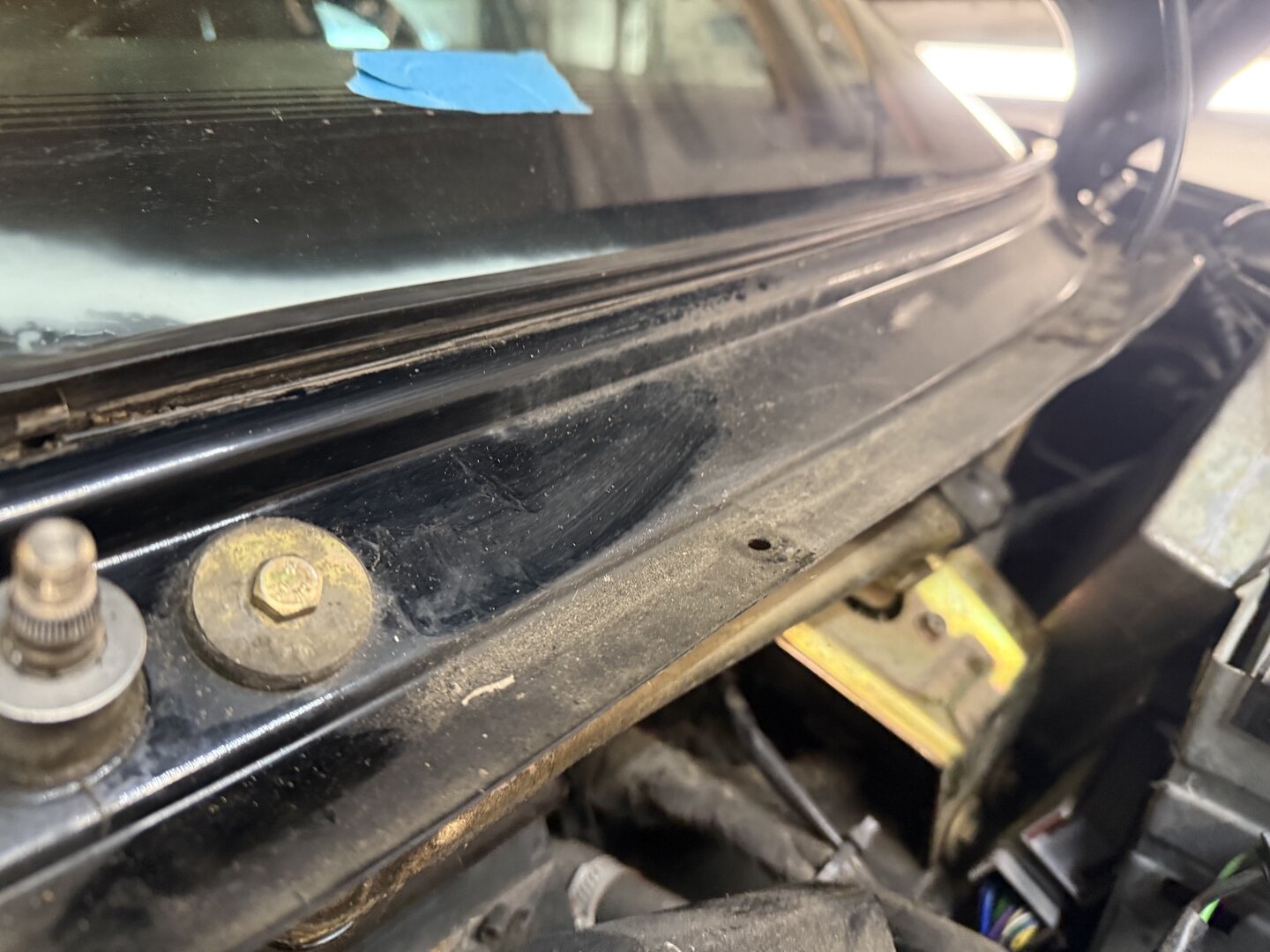 Die Scheibe fliegt auf jeden Fall raus. Sieht scheusslich aus. Und wenn ich Rost finden sollte, ist es jetzt noch wenig. Oben an der Fahrerseite liegt der hartgewordene Scheibenrahmen auch nicht an der Karosserie an. Da läuft also sicherlich auch Wasser rein. Das macht es nicht besser. Also lieber jetzt ne´n Tausender investieren...
