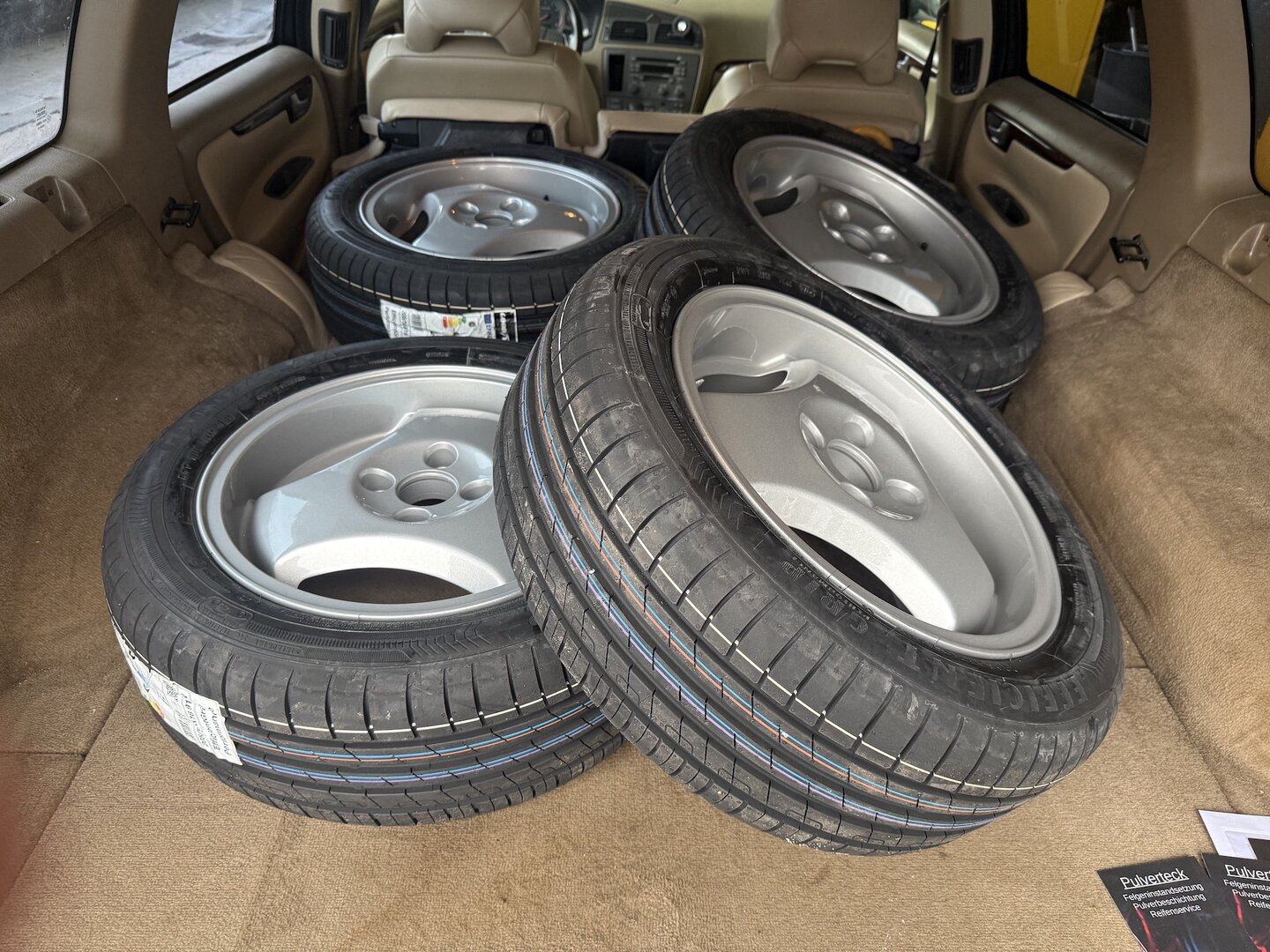 Sooo, weiter geht´s. Weil es so viel Spaß gemacht hat, hab ich noch mal die Innereien aus dem Aquarium gefischt. Beim Einbau des Radios lief die Zündung länger und mir ist dabei aufgefallen, dass der Innenraumlüfter ordentlich Geräusche machte. Hätte man auch gleich beim Tausch des Wärmetauschers ein paar Wochen zuvor prüfen können. Eigene Blödheit, also noch mal... Dann hab ich noch die Rakarör drunter geschraubt. Gefällt mir ganz gut. Wenn ich noch ne passende, dezente Blende finde, kommt die da drauf. Ansonsten bleibt es so. Die Felgen sind mir neulich zu gelaufen, war ein unvollständiger Satz. Habe dann noch weitere hier über das Forum kaufen können und sie anschließend aufbereiten und pulvern lassen. Neue Sohlen gab es dazu. Sind zwar nicht die Aeros, aber optisch ja nicht so weit davon entfernt. Mir gefällt es. Die Kirmes-Popporgel, die vorher verbaut war, habe ich durch das aktuelle Blaupunkt Frankfurt ersetzt. Da gibt es ja geteilte Meinungen zu. Ich fahre es seit 2024 auch im 900er und bin sehr zufrieden. Also hab ich dem 9000er ebenfalls eines spendiert. Als nächstes ist dann die Scheibe und die Klima dran. Da der Wischwasserbehälter undicht ist, hab ich den ausgebaut und Platz geschaffen, so das die Werkstatt auch gut an die Trocknerpatrone herankommt. Der Behälter wird dann mit Sikaflex abgedichtet.