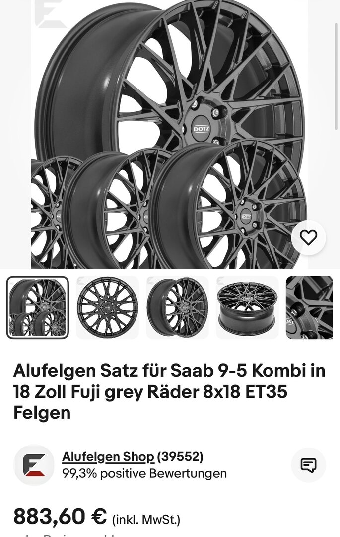 Die Hirsch-Performance-Felgen (es gibt einige im Angebot) Kosten zwischen 1400-2800 Euro. Dazu kämen zT noch Lackierkosten (so ca. 500 Euro) und angefräste Kanten. Das Teile-Gutachten bekomme ich scheinbar nicht so einfach - und Risse bekommen die scheinbar auch. Anbei ein Bilder schöner Felgen am 9-5. Einmal sogar die 10-Spoke 9-5 NG Felgen mit dem größeren Lochkreis montiert. Ich habe Aftermarkt-Felgen mit Gutachten herausgesucht, die passen sollten. Hat jemand Erfahrung damit ? Das wäre in 28 Jahre Saab die erste Runde ohne org. Saab Felgen …