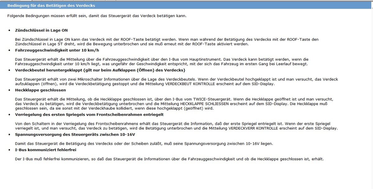 Ich kann nur wiederholen: ohne Tech2 wird das wohl nichts, aber noch wichtiger ist, sich mit der Funktion des Verdecks in seinen Details so ausgiebig zu befassen, dass man seine Steuerung versteht - nur dann kann man daran Fehler beheben und ggf. reparieren.