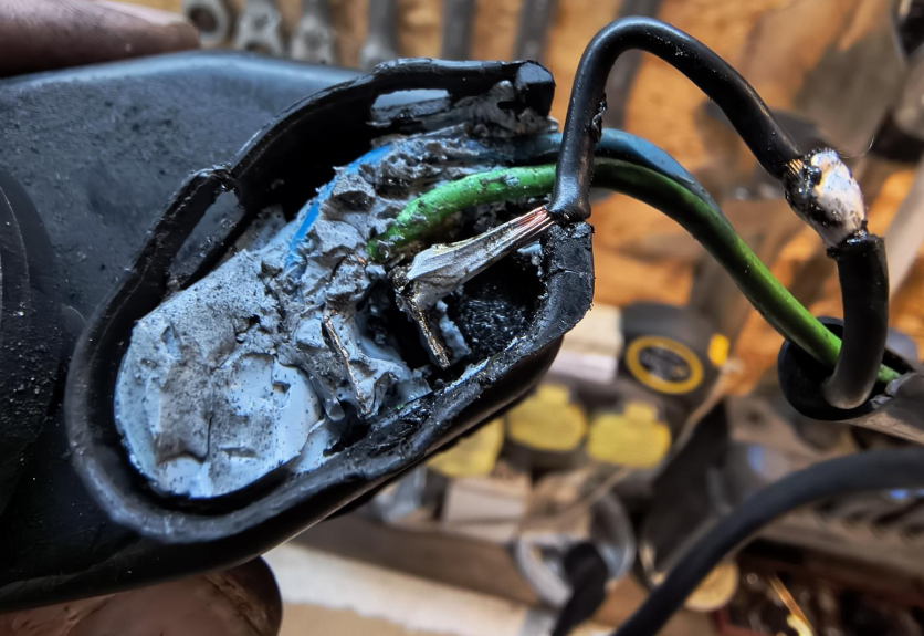 Beim erneuten Ausbau fand sich schnell die Ursache: eins der 3 Kabel war direkt am EIntritt in das Gehäuse abgebrochen.