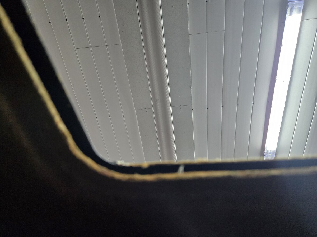 Falls du beim Neubezug den Stoff am Schiebedach-Ausschnitt einfach nur umgeschlagen und festgeklebt hast, dann war das falsch. Der Stoff wird um den Ausschnitt im Schiebedach gespannt und verklebt.